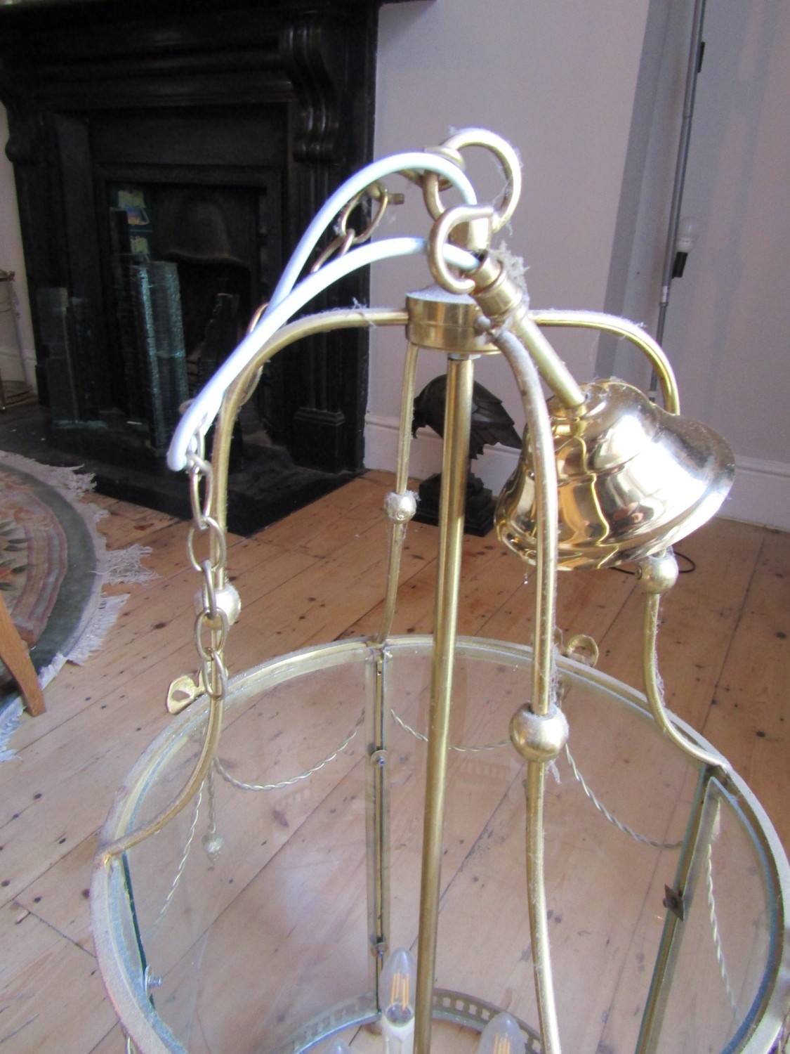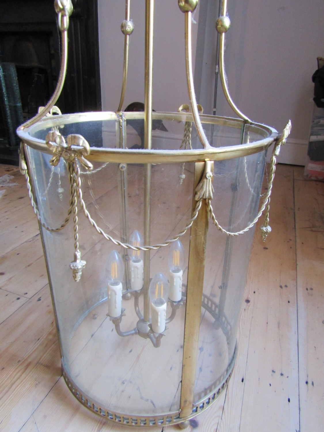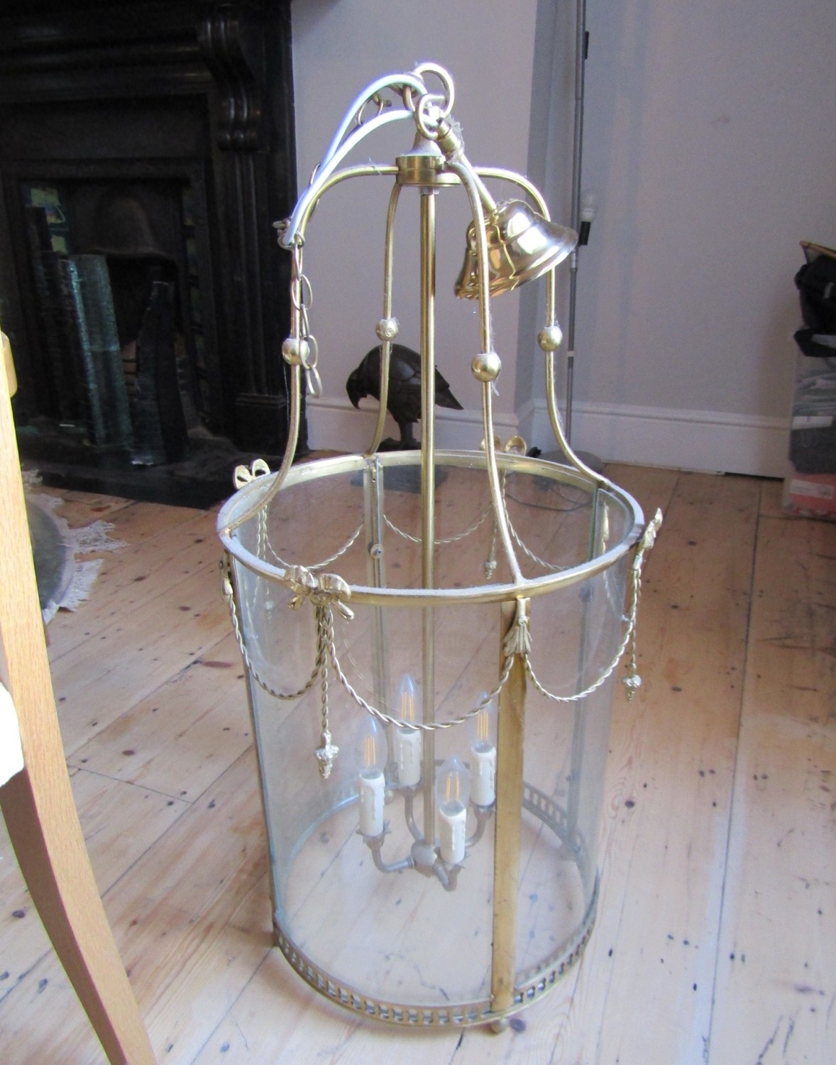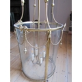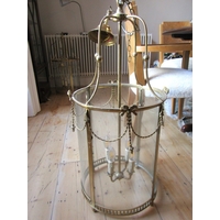Cast Brass Circular Form Ceiling Lantern with Inset Glass Panels Good Original Condition Fittings Present with Ceiling Rose and Hanging Chain Working Order Lantern Approximately 20 Inches High
