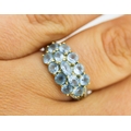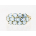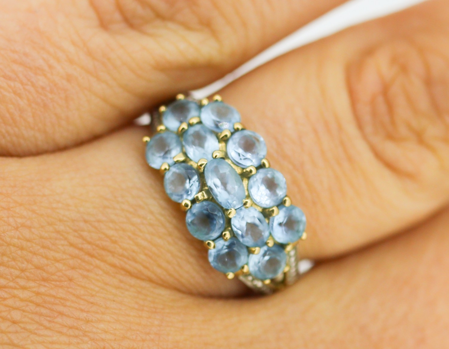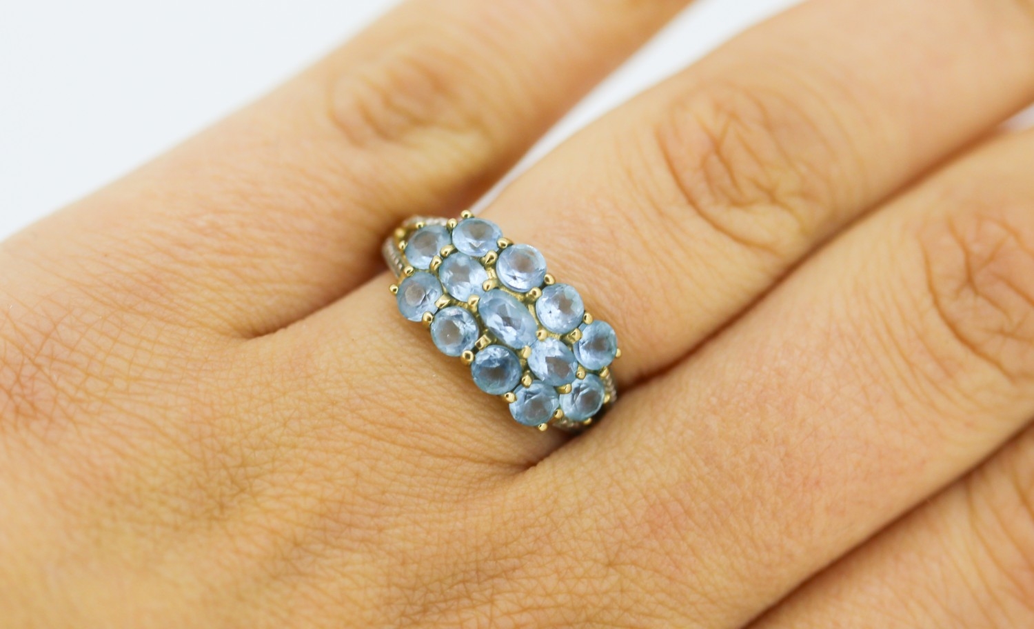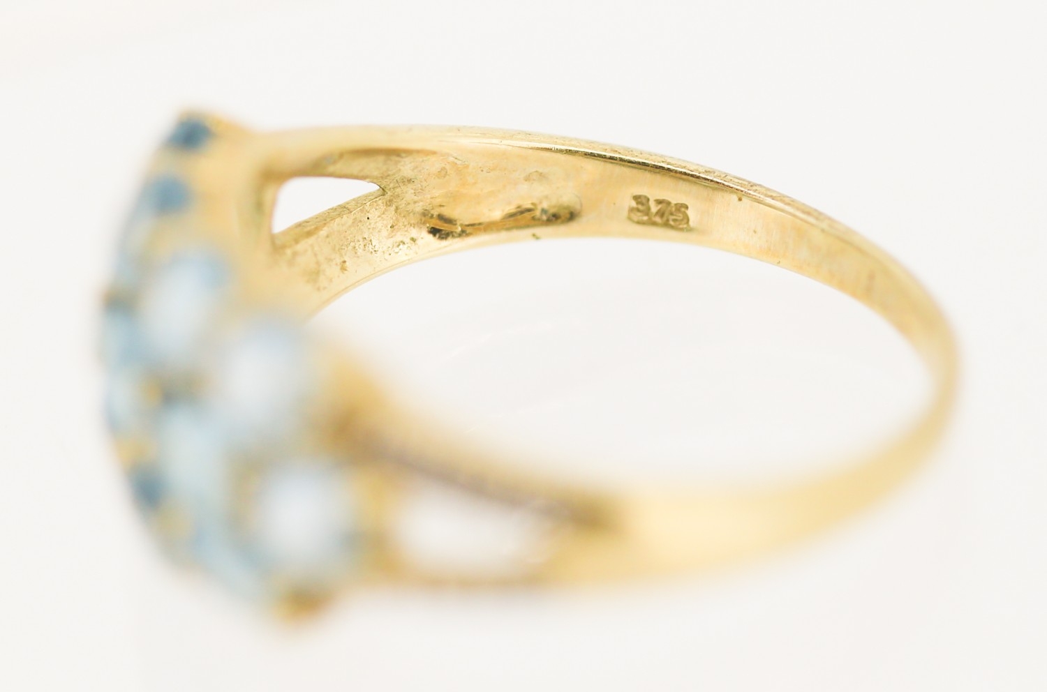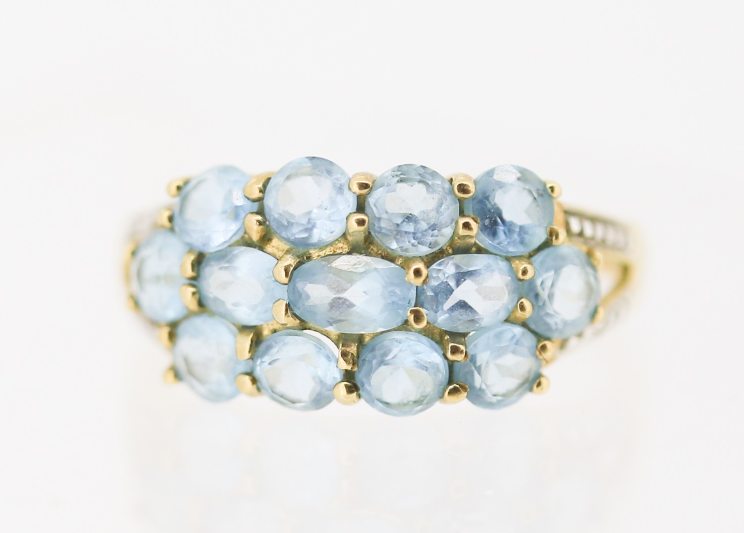 Blue Topaz Set Cluster Ring with Diamond Inset to Shoulders Mounted in 9 Carat Yellow Gold Ring Size P