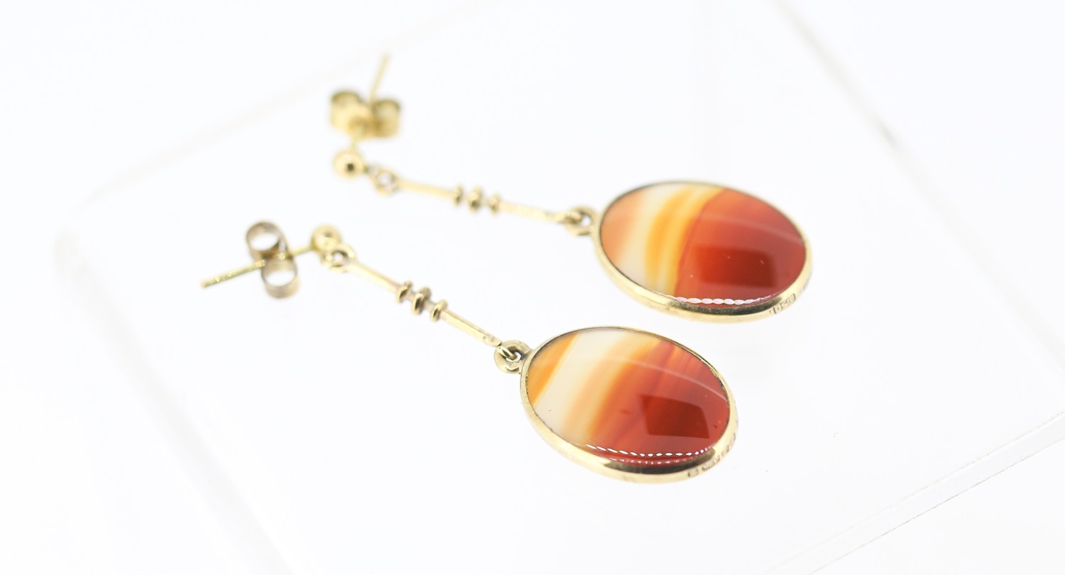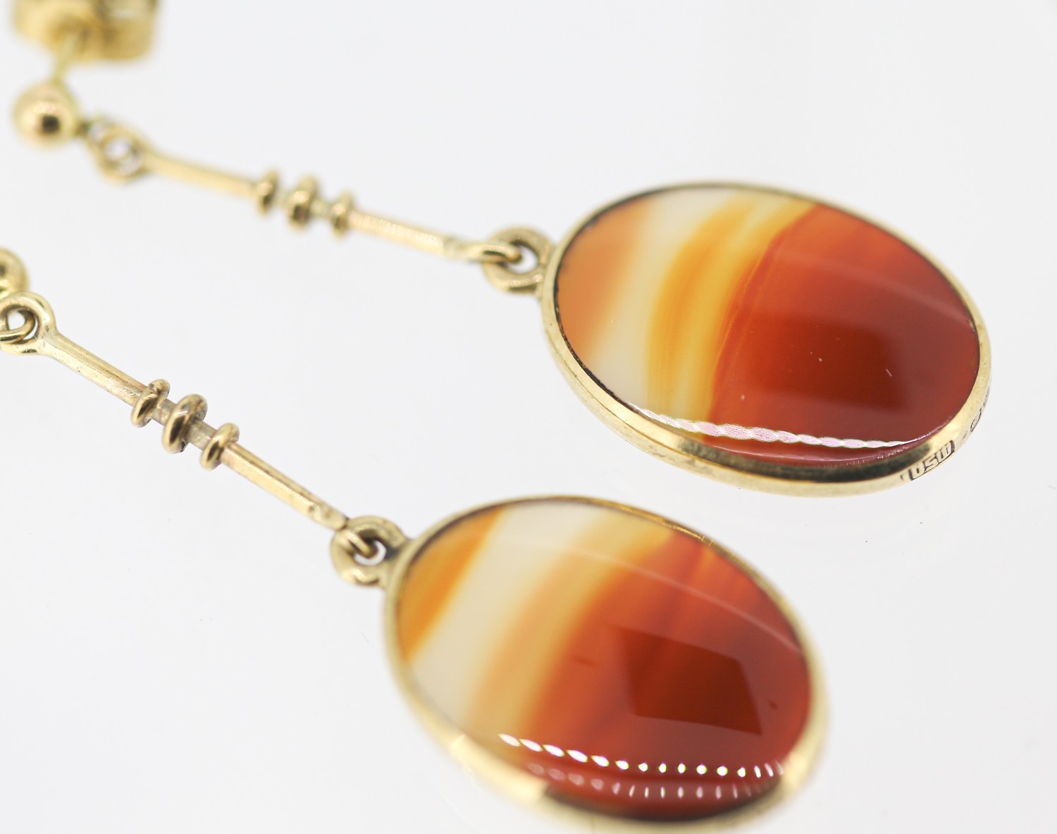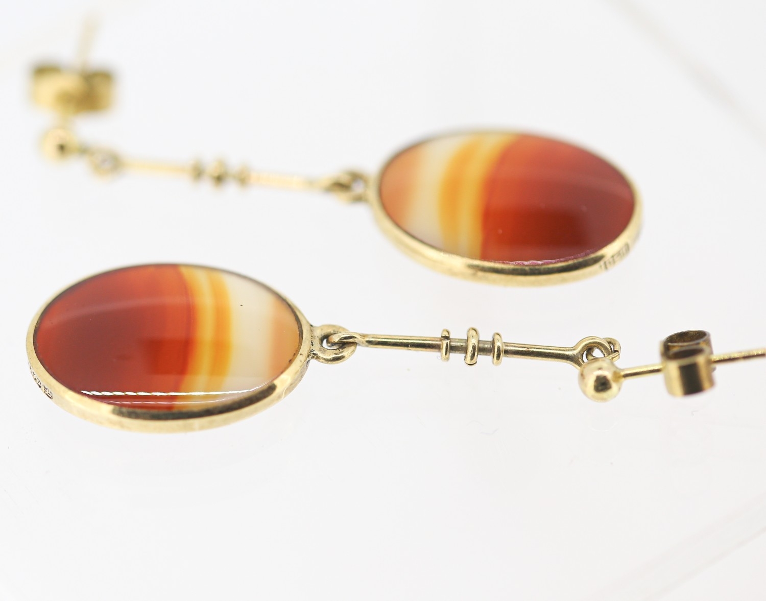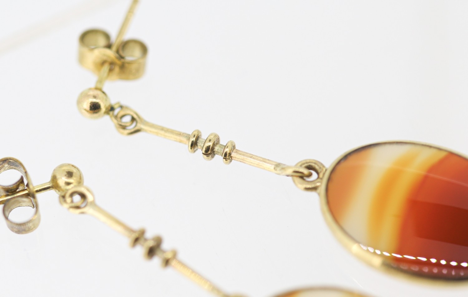 Pair of Attractively Detailed Bezel Set Agate Drop Earrings Mounted in 9 Carat Yellow Gold 4cm Drop