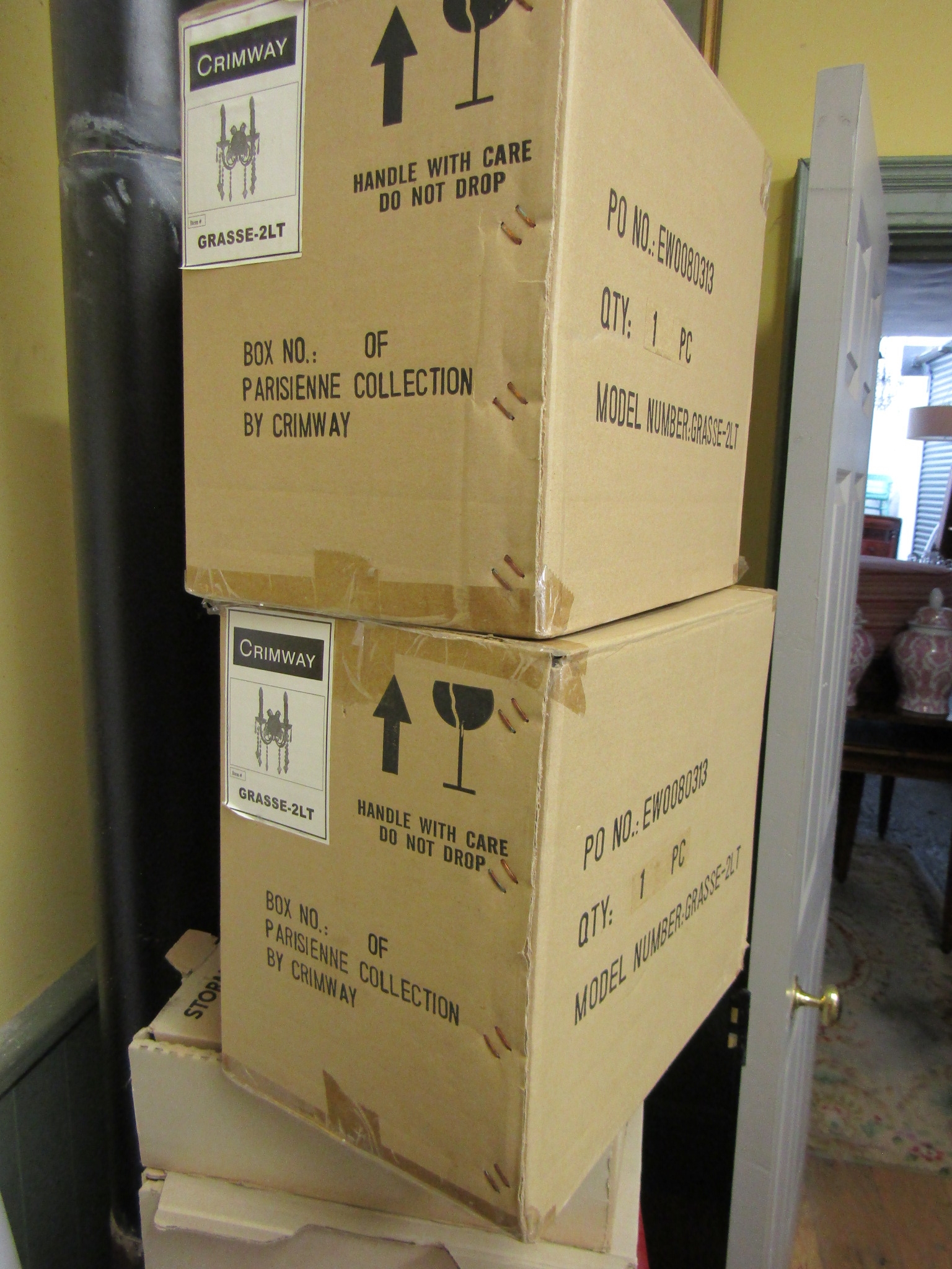 Pair of Designer Twin Sconce Side Wall Lights with Hanging Lustres as New Contained Within Original Boxes