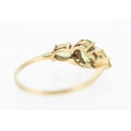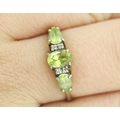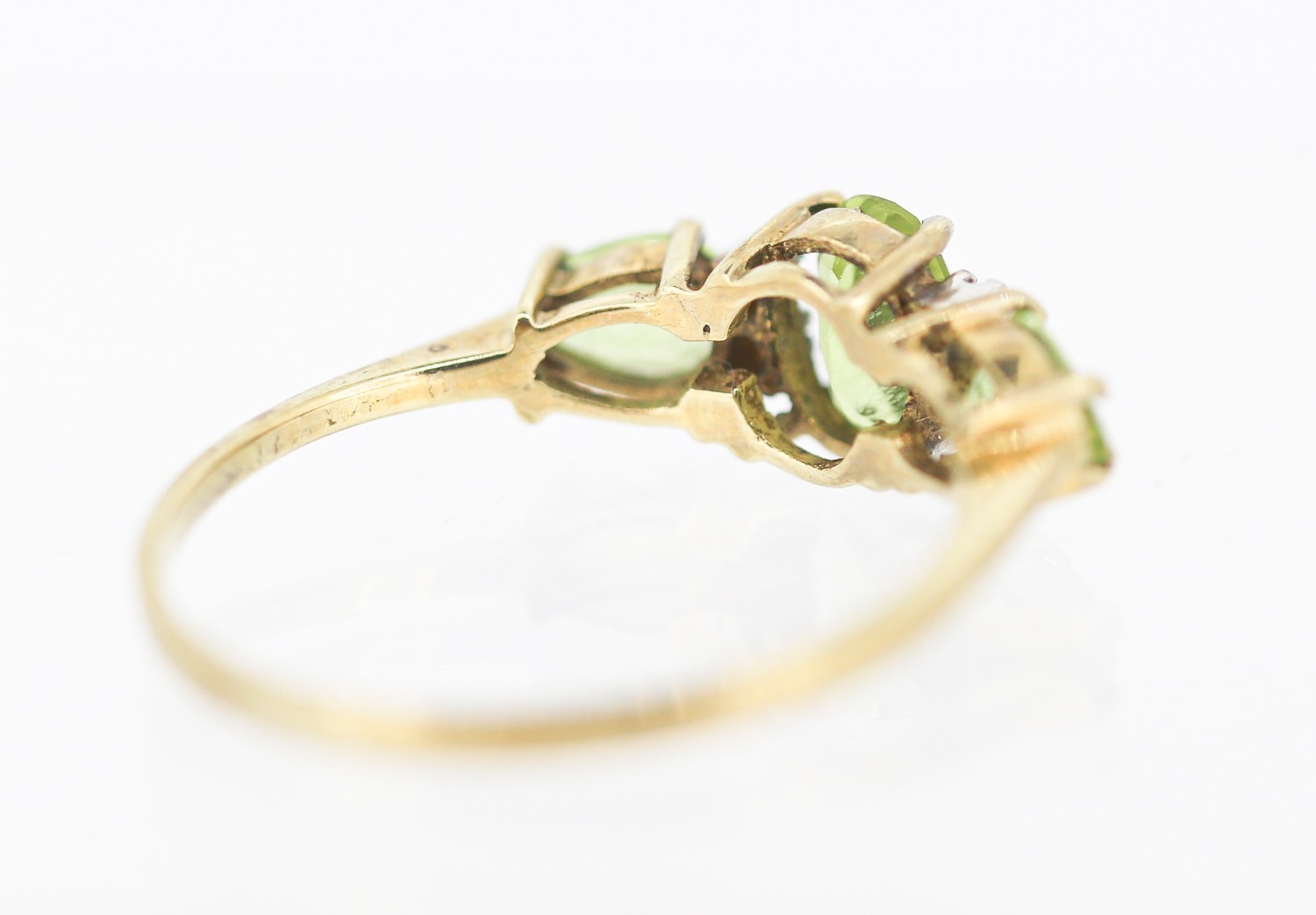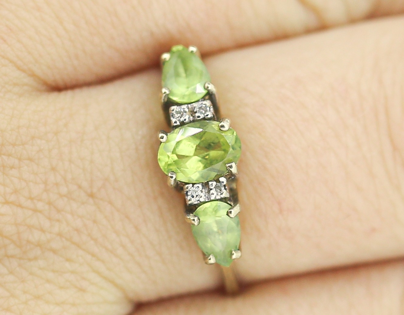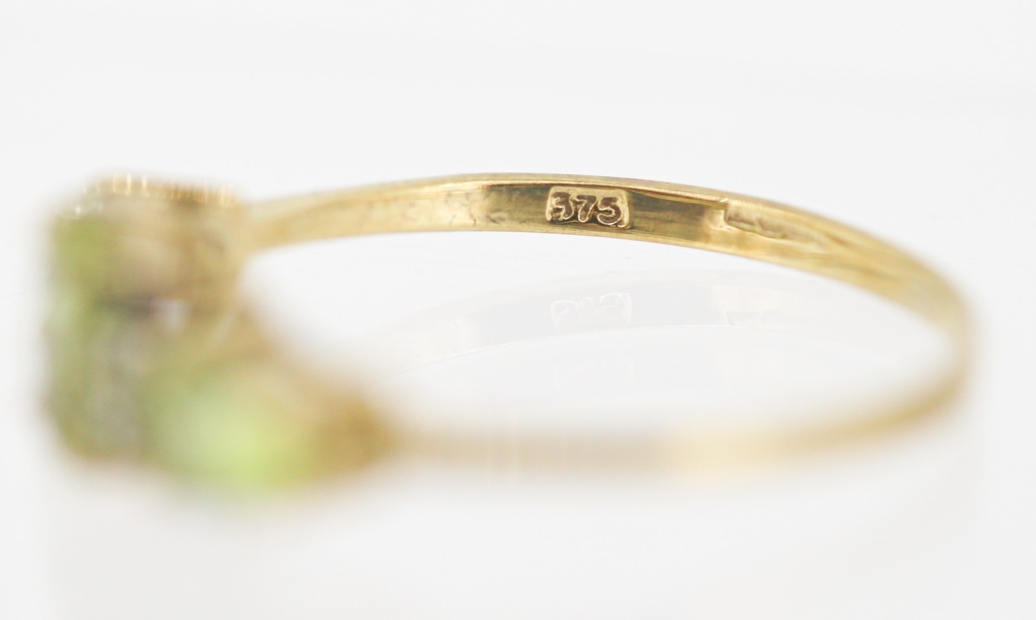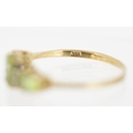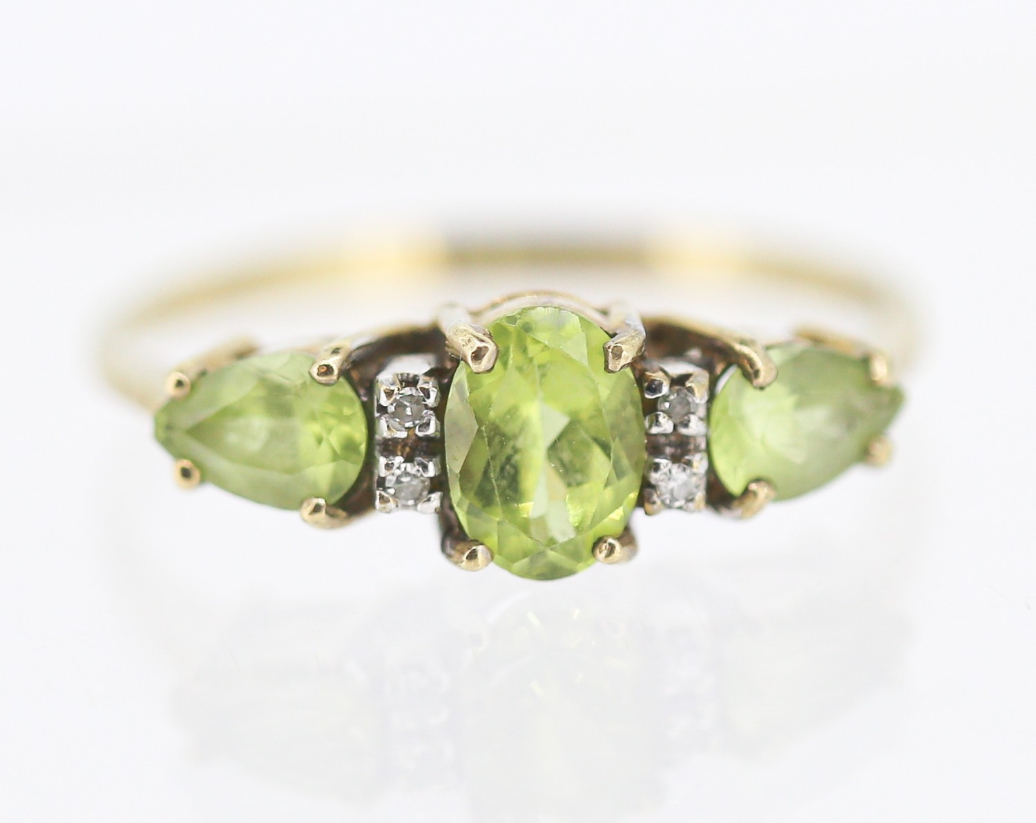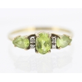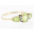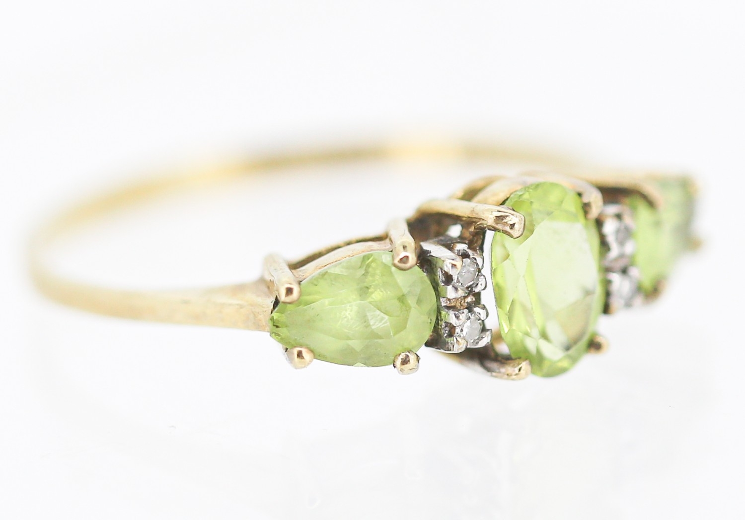 Peridot Set Three Stone Ring with Further Diamond Insets Mounted in 9 Carat Yellow Gold Ring Size T