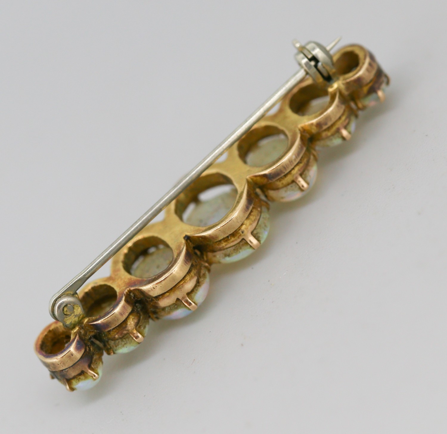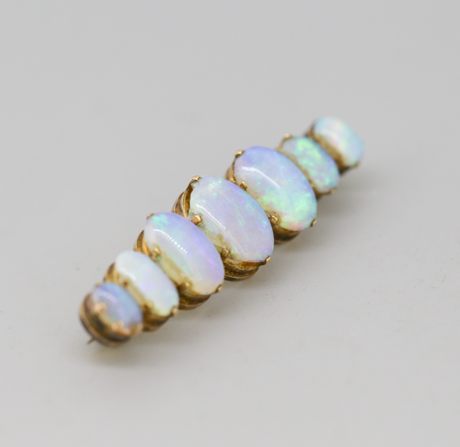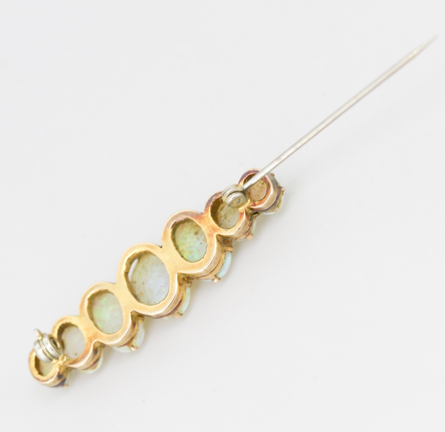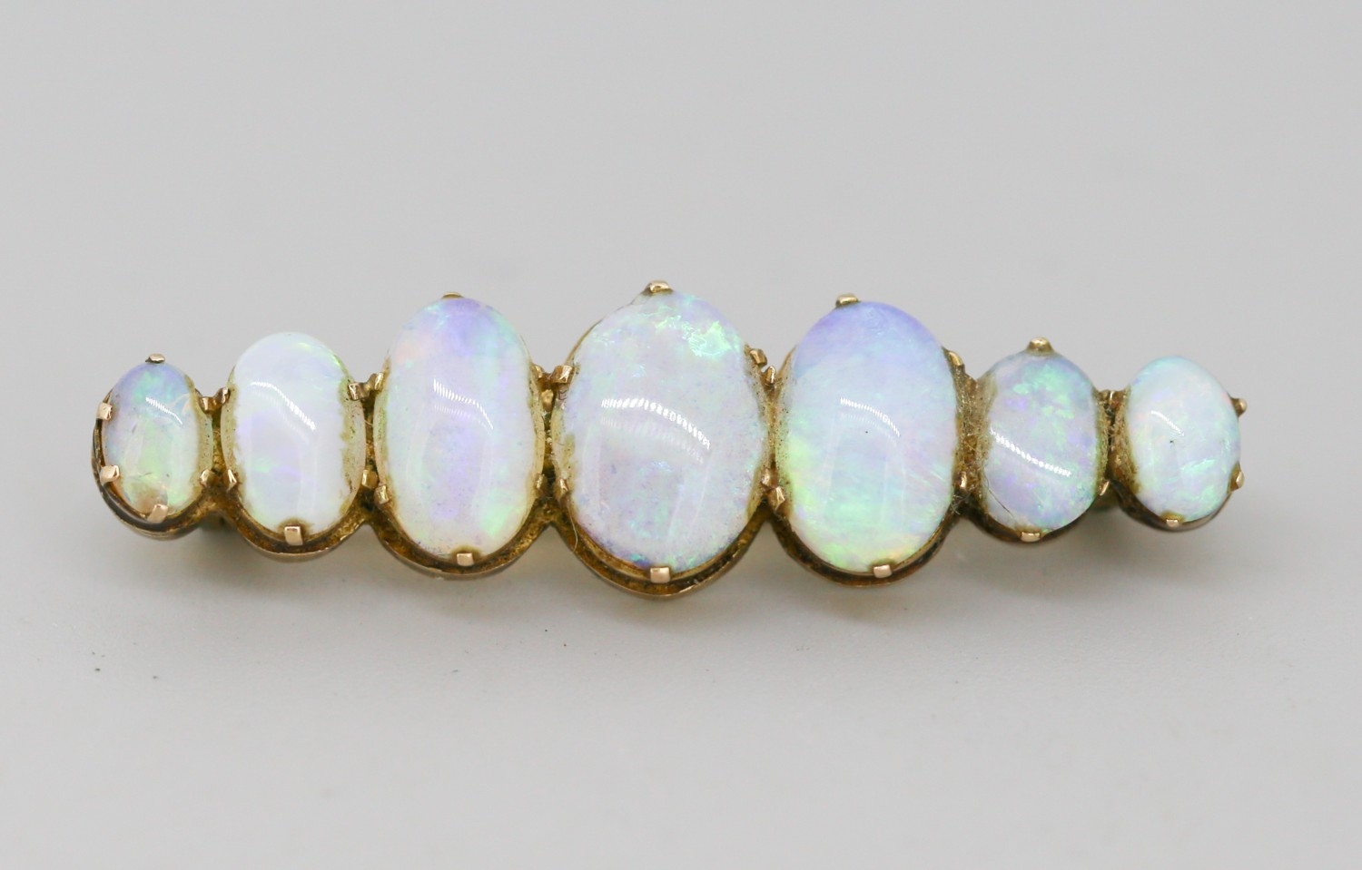 Opal Seven Stone Graduated Form Brooch Mounted in 9 Carat Yellow Gold 4cm