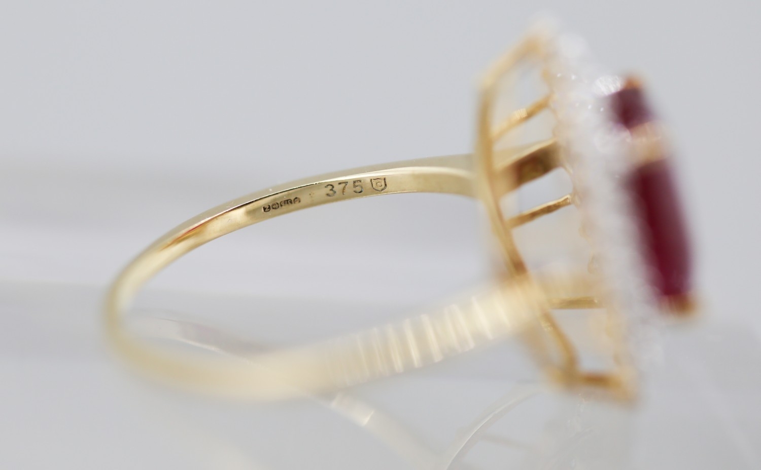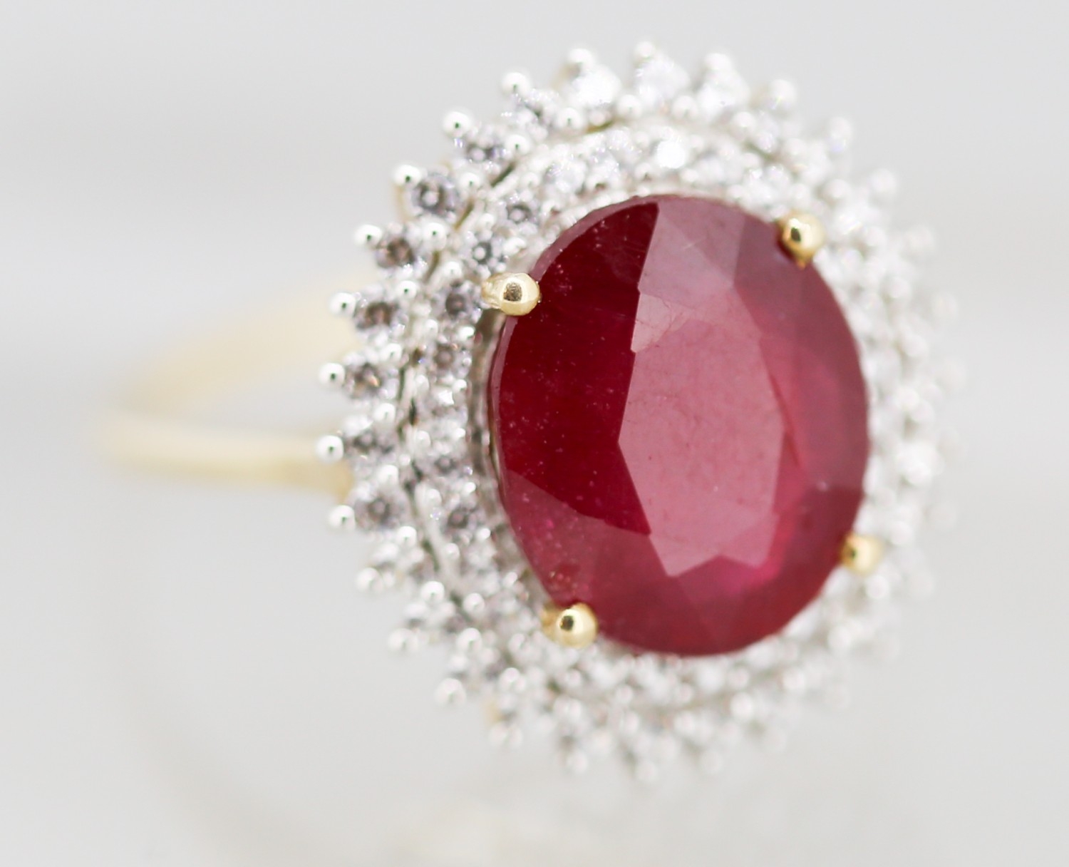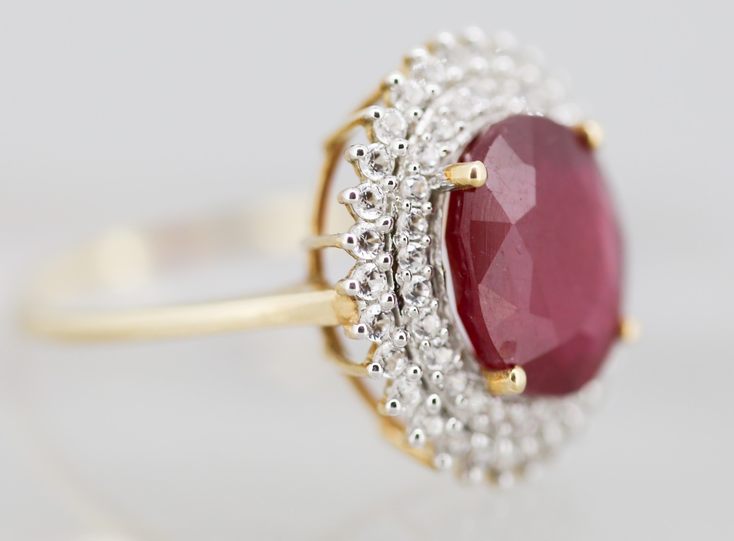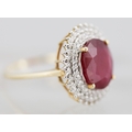 Ruby Centre Stone Ring with Gemstone Set Double Halo Surround Mounted in 9 Carat Yellow Gold Ring Size T and a Half