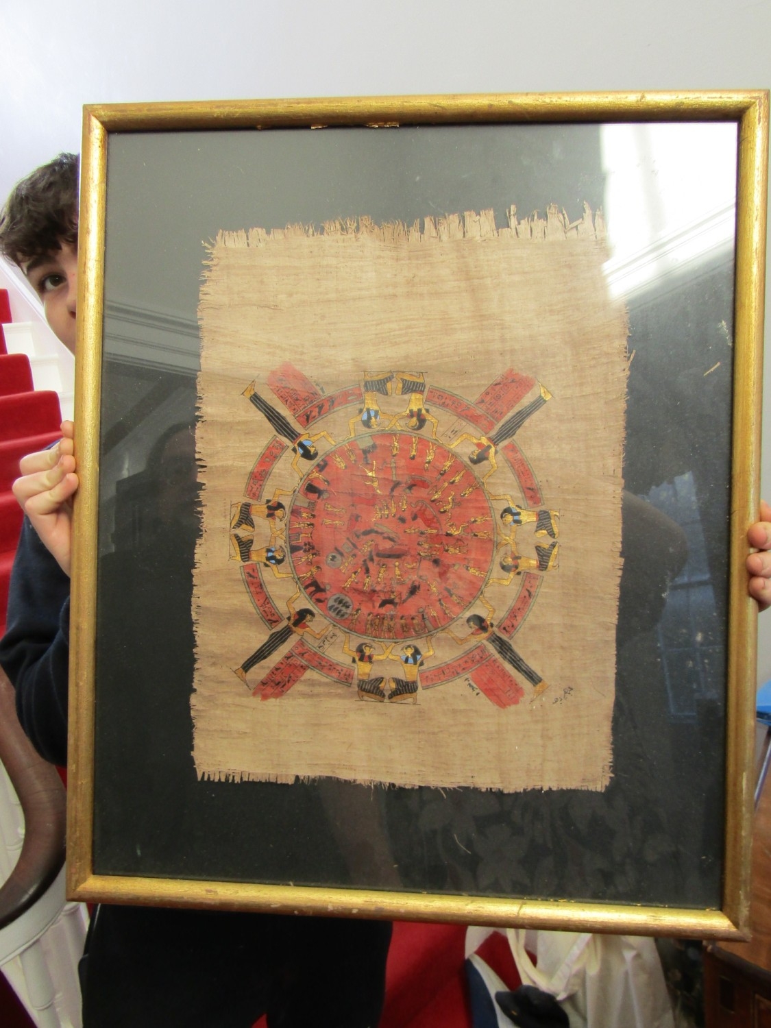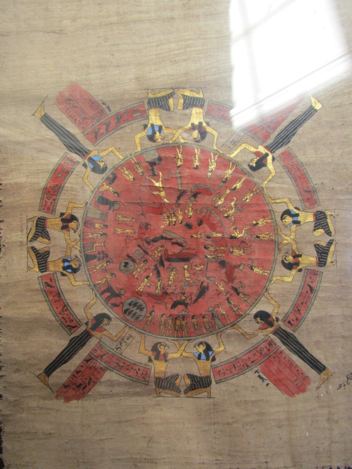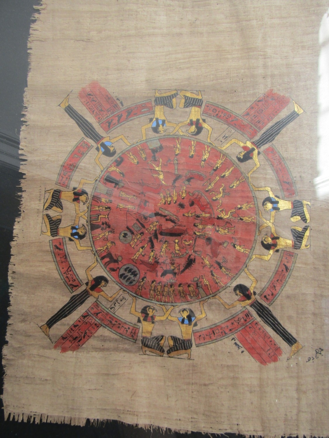 Egyptian Gilt and Ink Decorated Papyrus Astrology Chart with Figural Symbols etc Contained within Glazed and Gilded Frame Approximately 20 Inches High by 12 Inches Wide