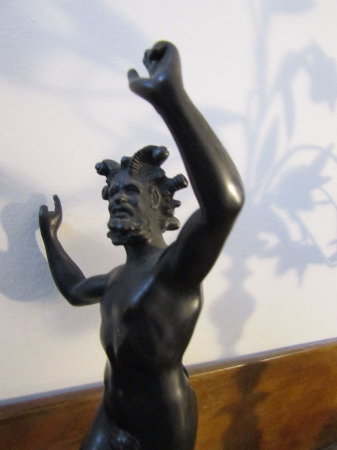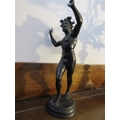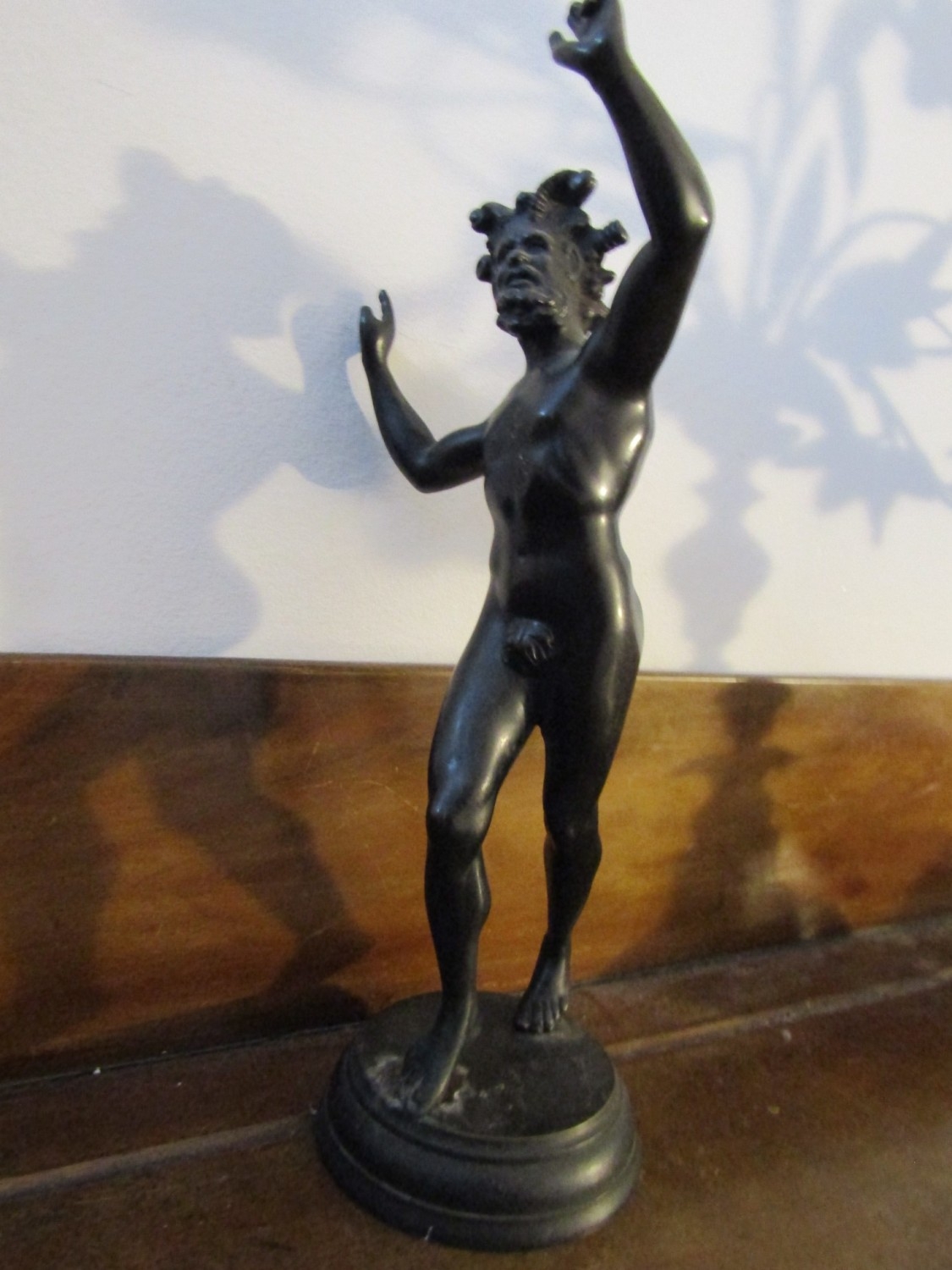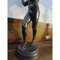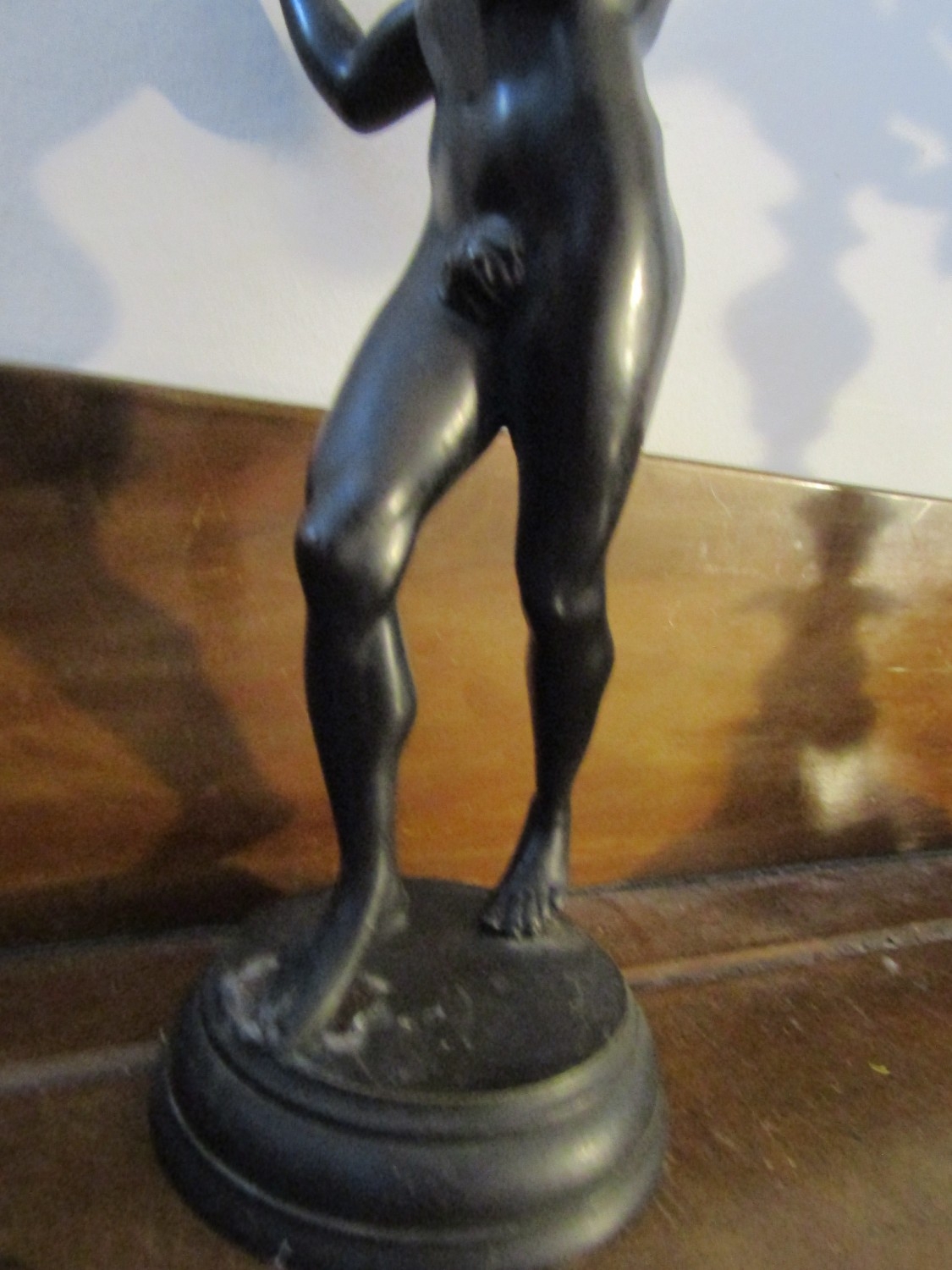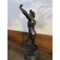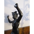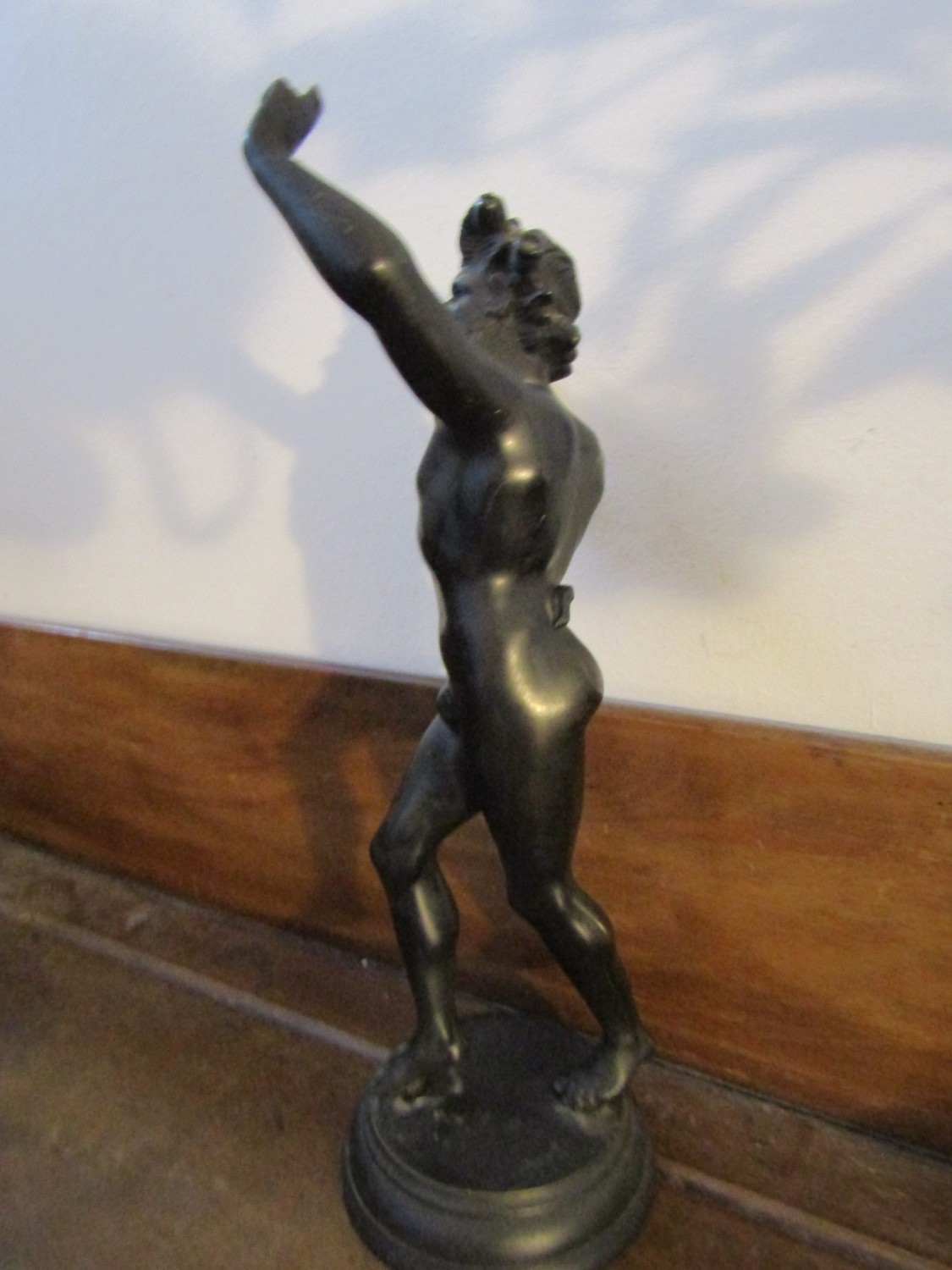 Antique Bronze Figure Greek School Man with Arms Aloft Integral Circular Stepped Base Approximately 11 Inches High
