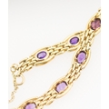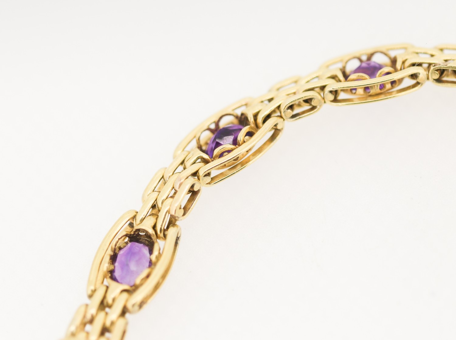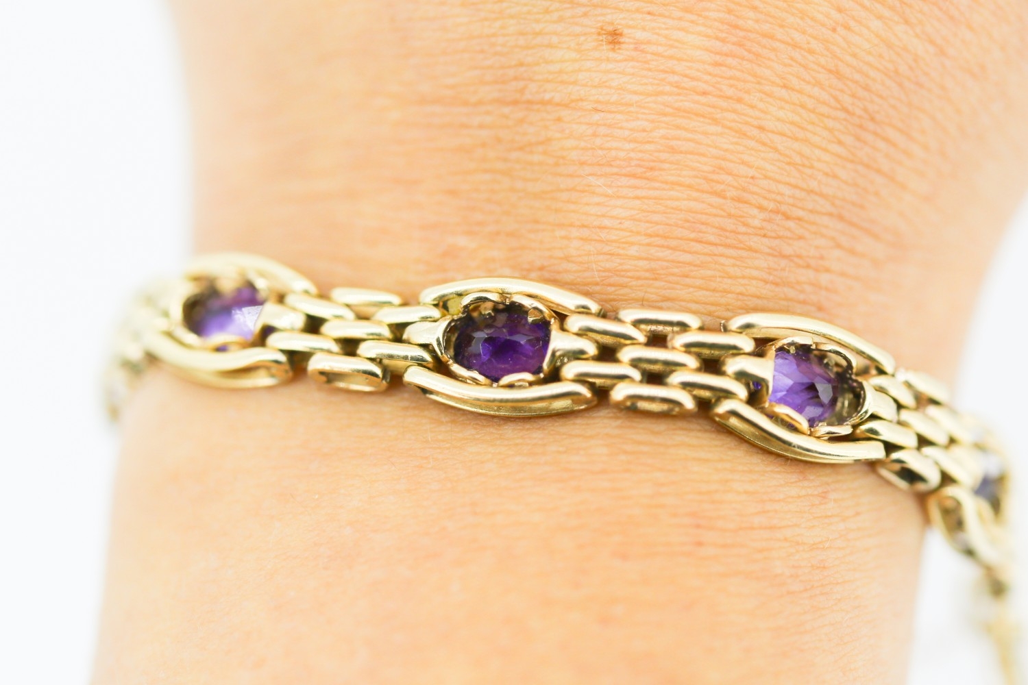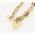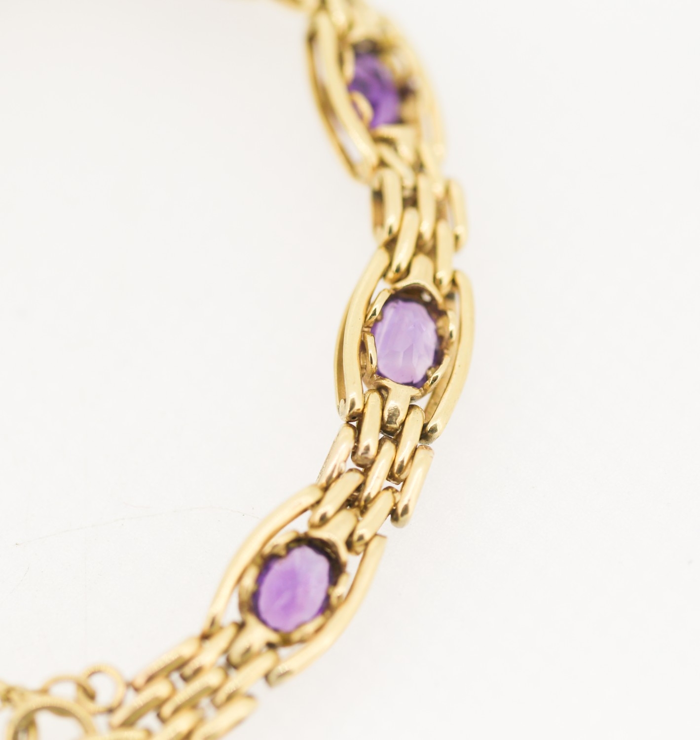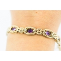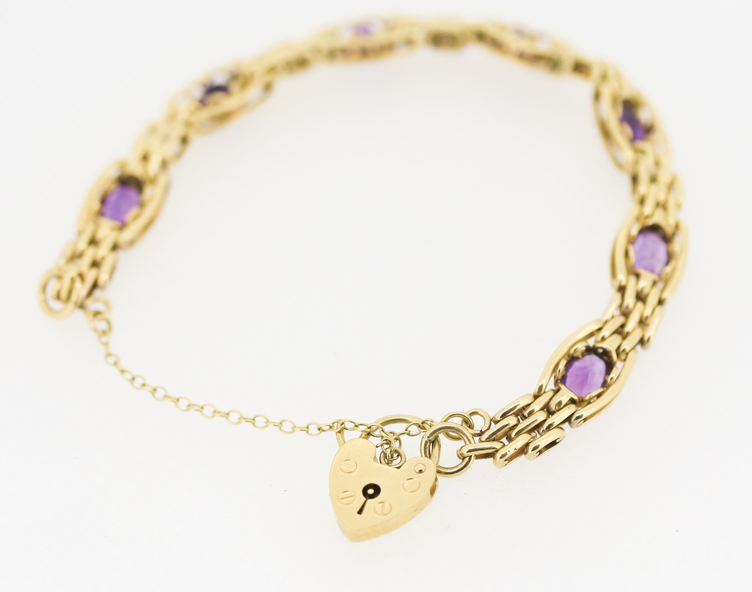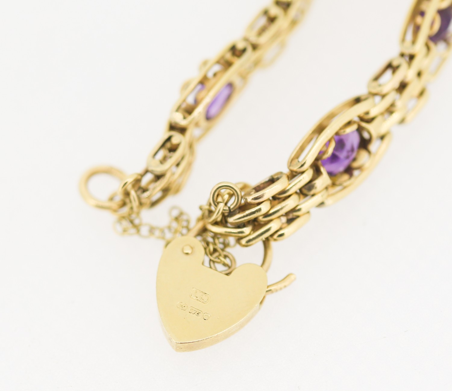 Amethyst Seven Stone Bezel Set Gate Link Bracelet Mounted in 9 Carat Yellow Gold with Heart Padlock Clasp 18cm Long