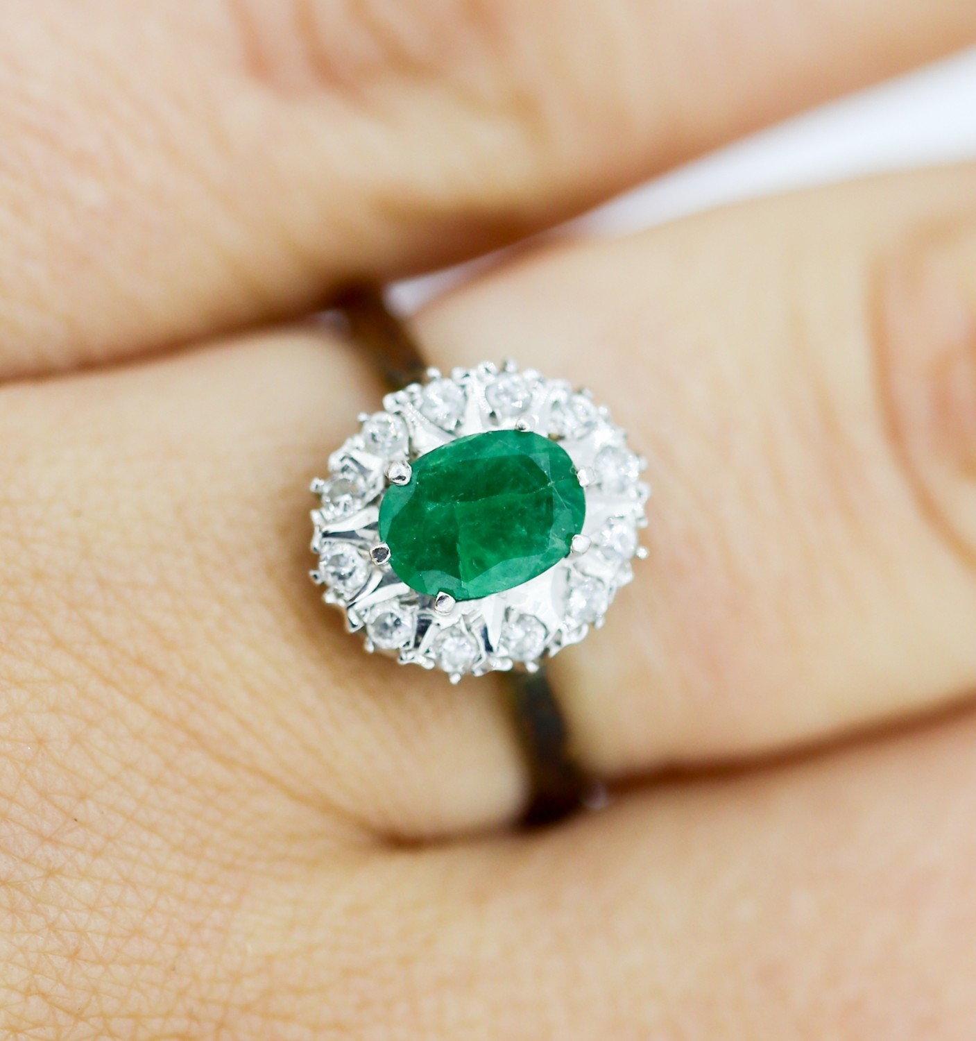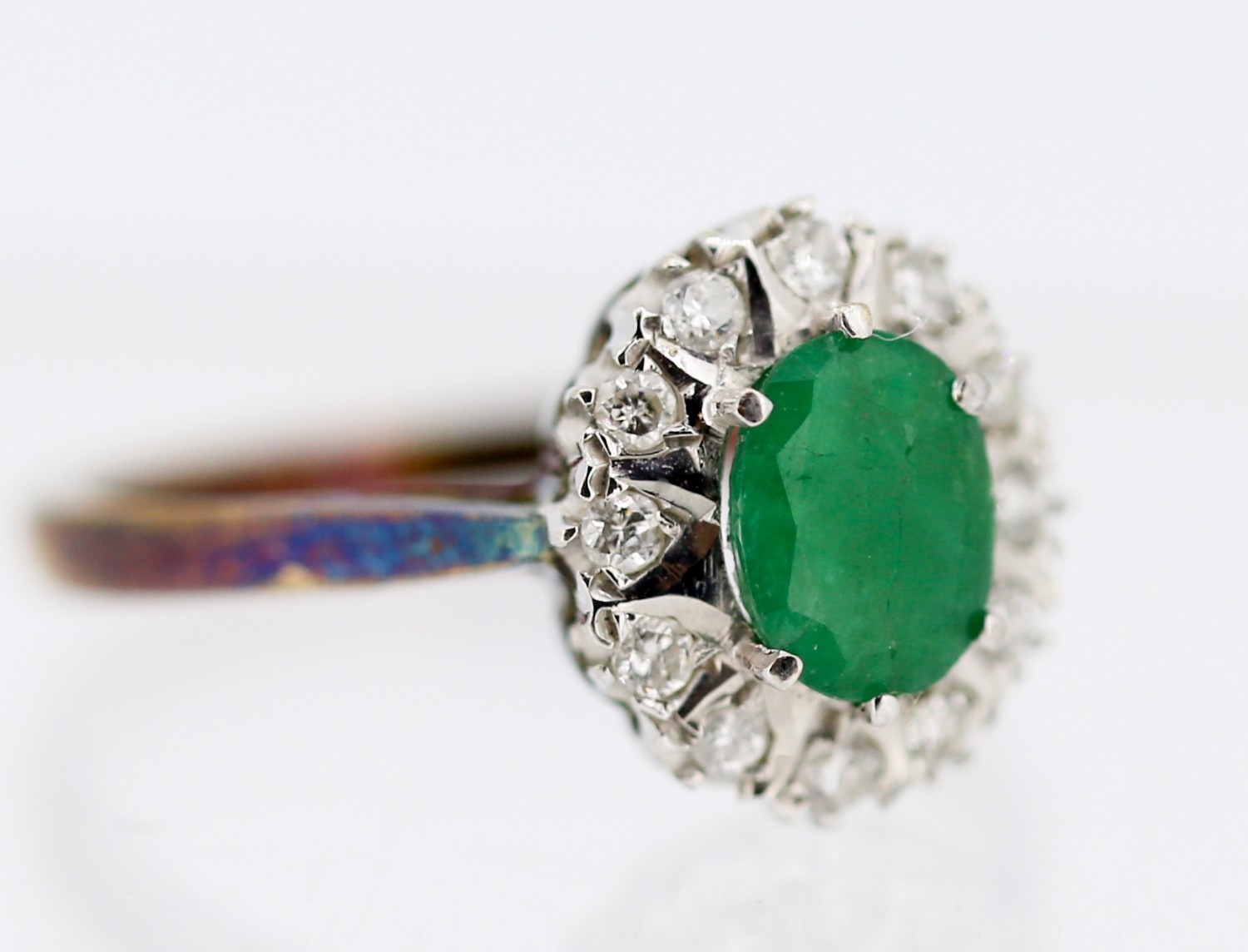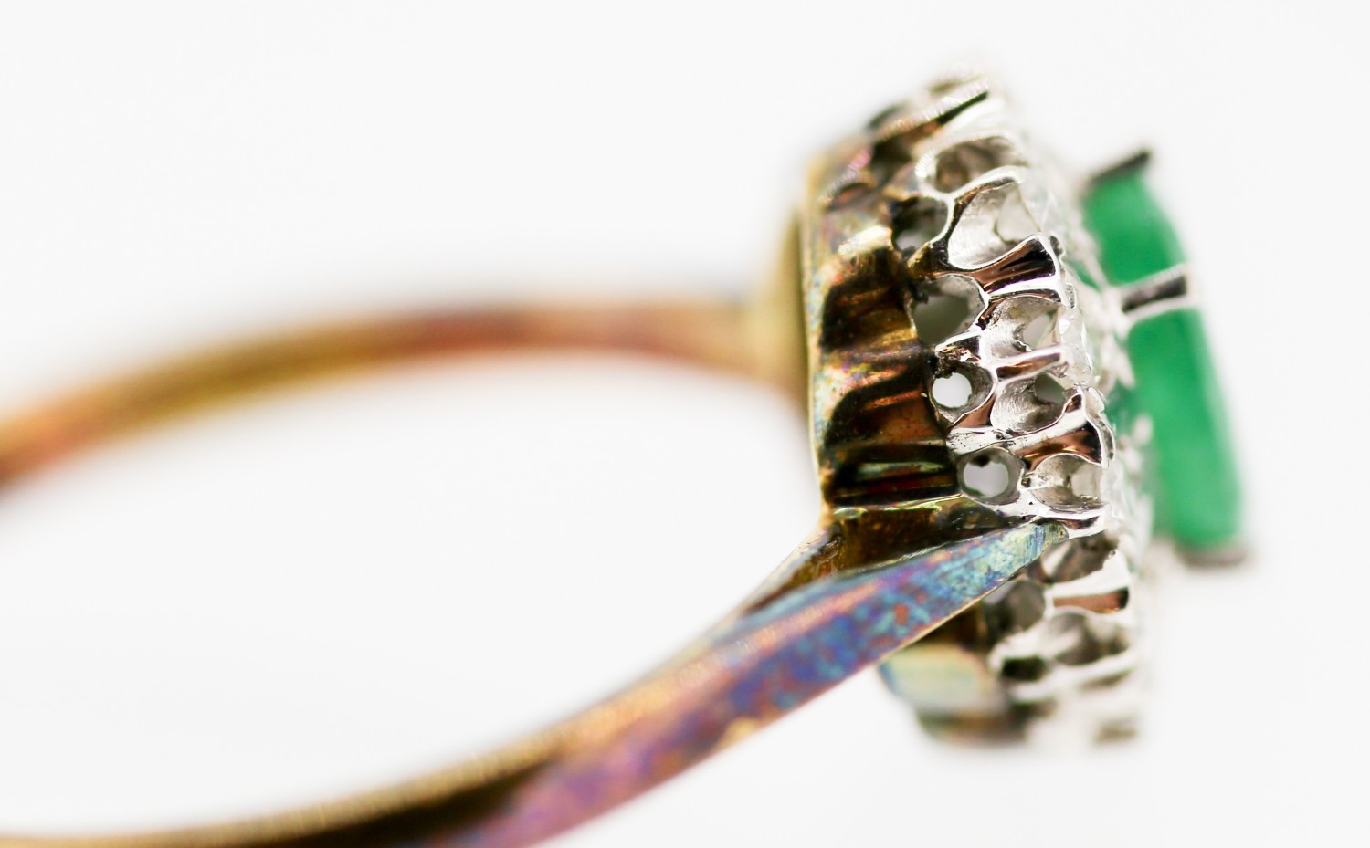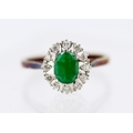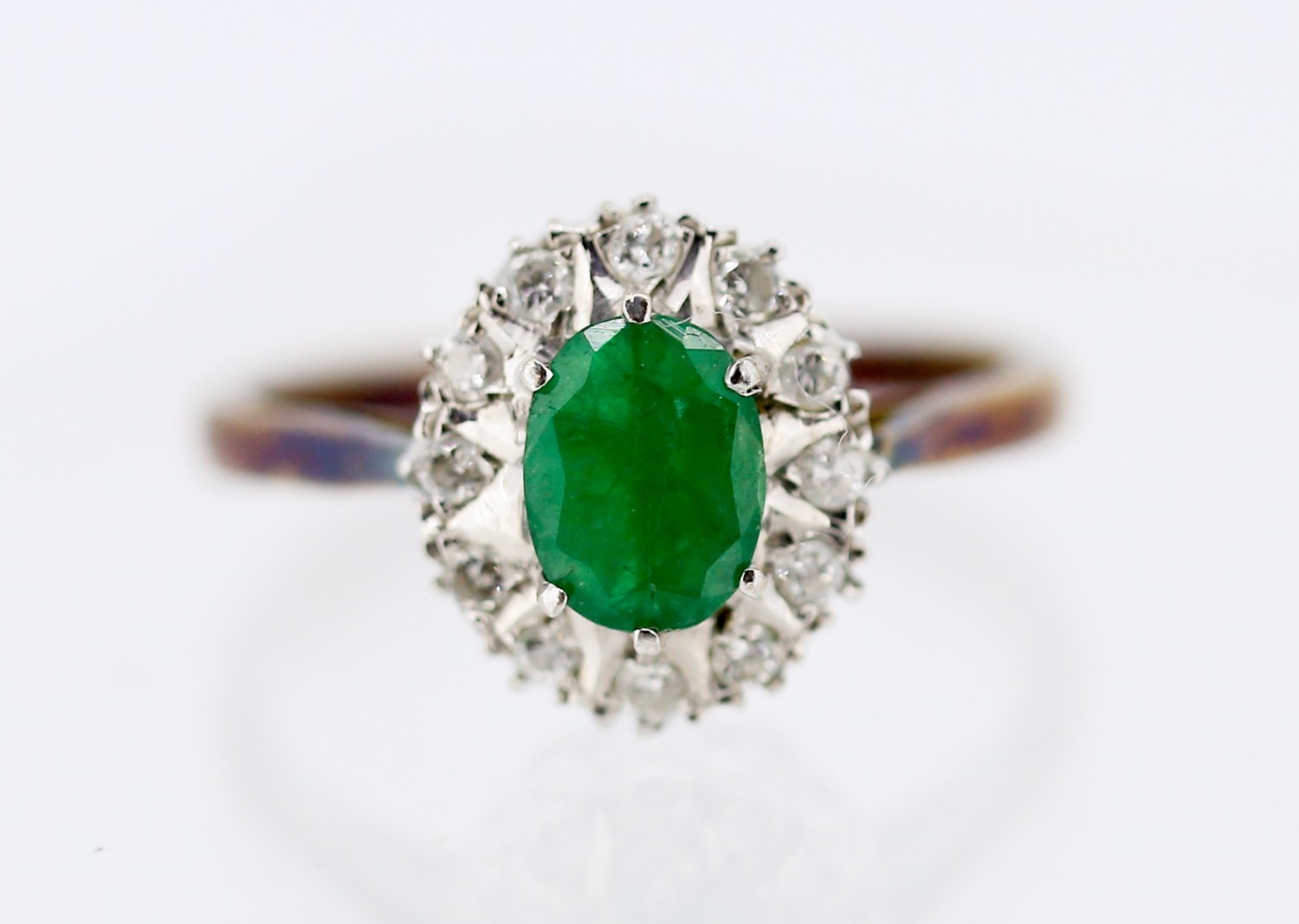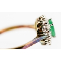 Finely Detailed Emerald Centre Stone Ring with Diamond Set Surround Mounted in 18 Carat Yellow Gold Emerald Approximately .50ct Ring Size M and a Half