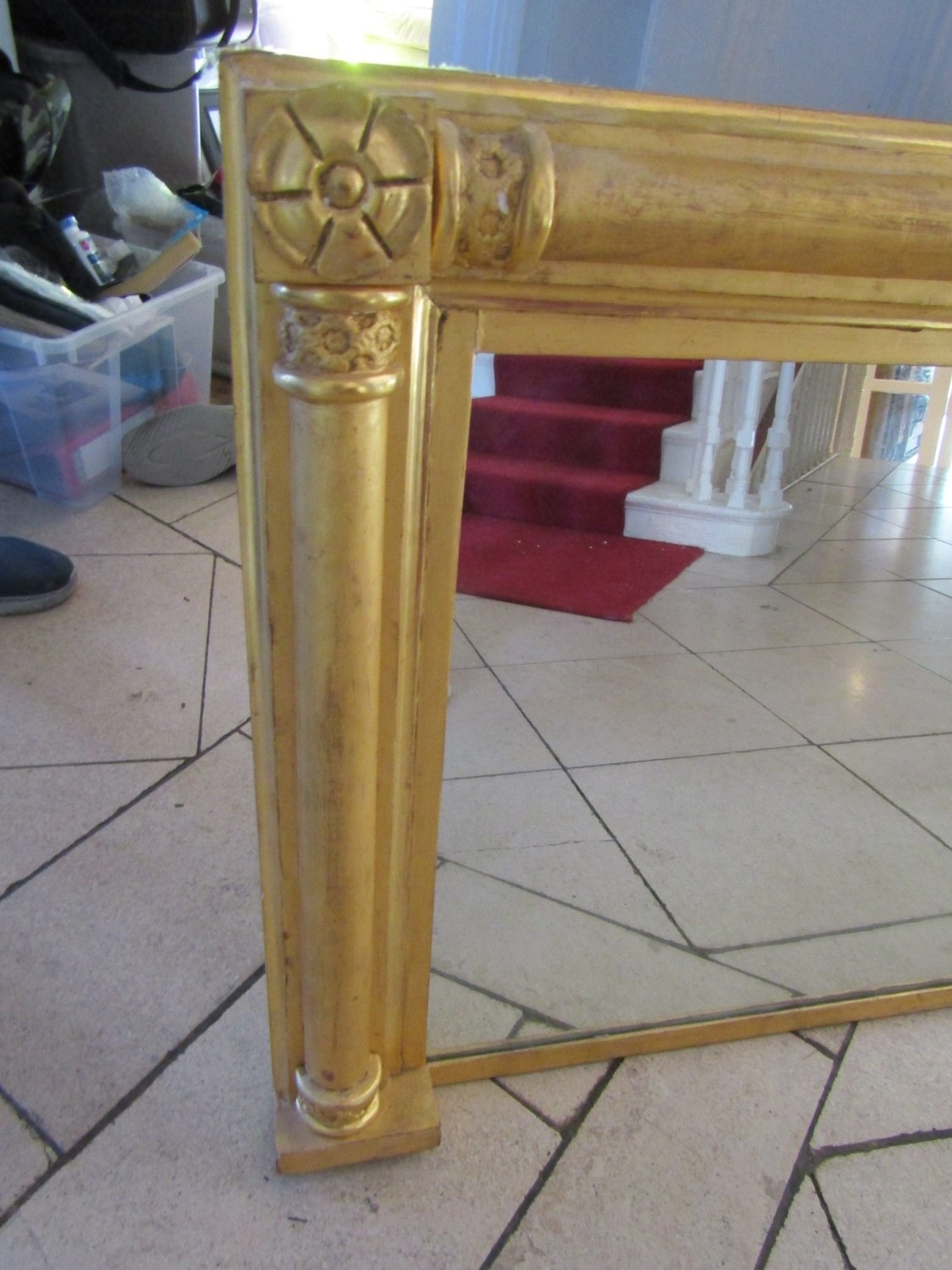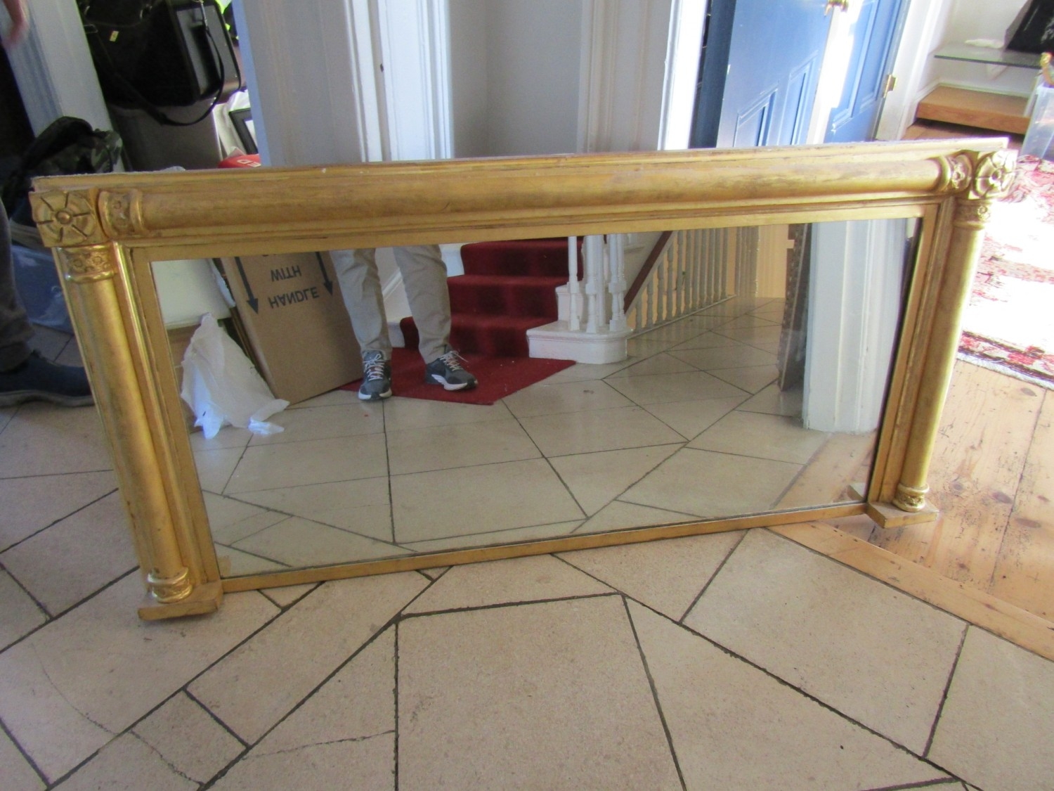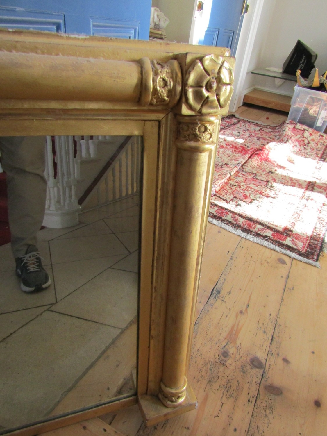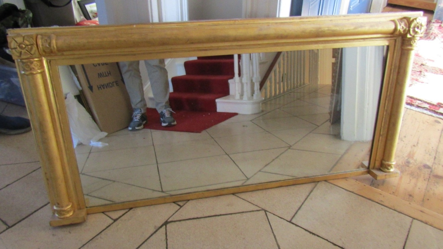 William IV Gilded Rectangular Form Overmantel Mirror with Rosette Leaf Upper Corner Side Column Decoration Approximately 58 Inches Wide