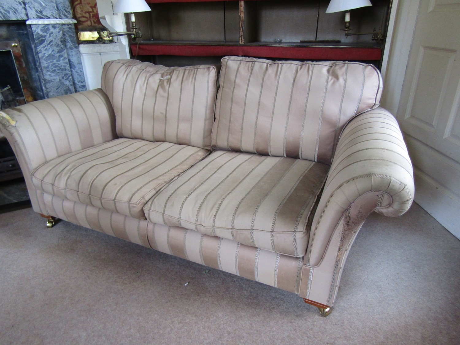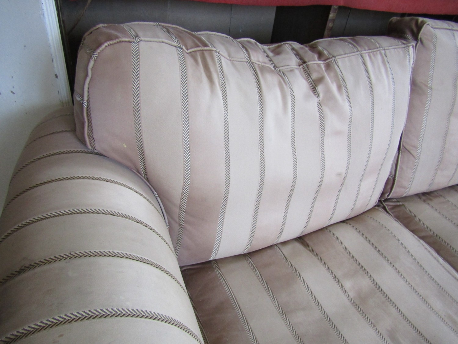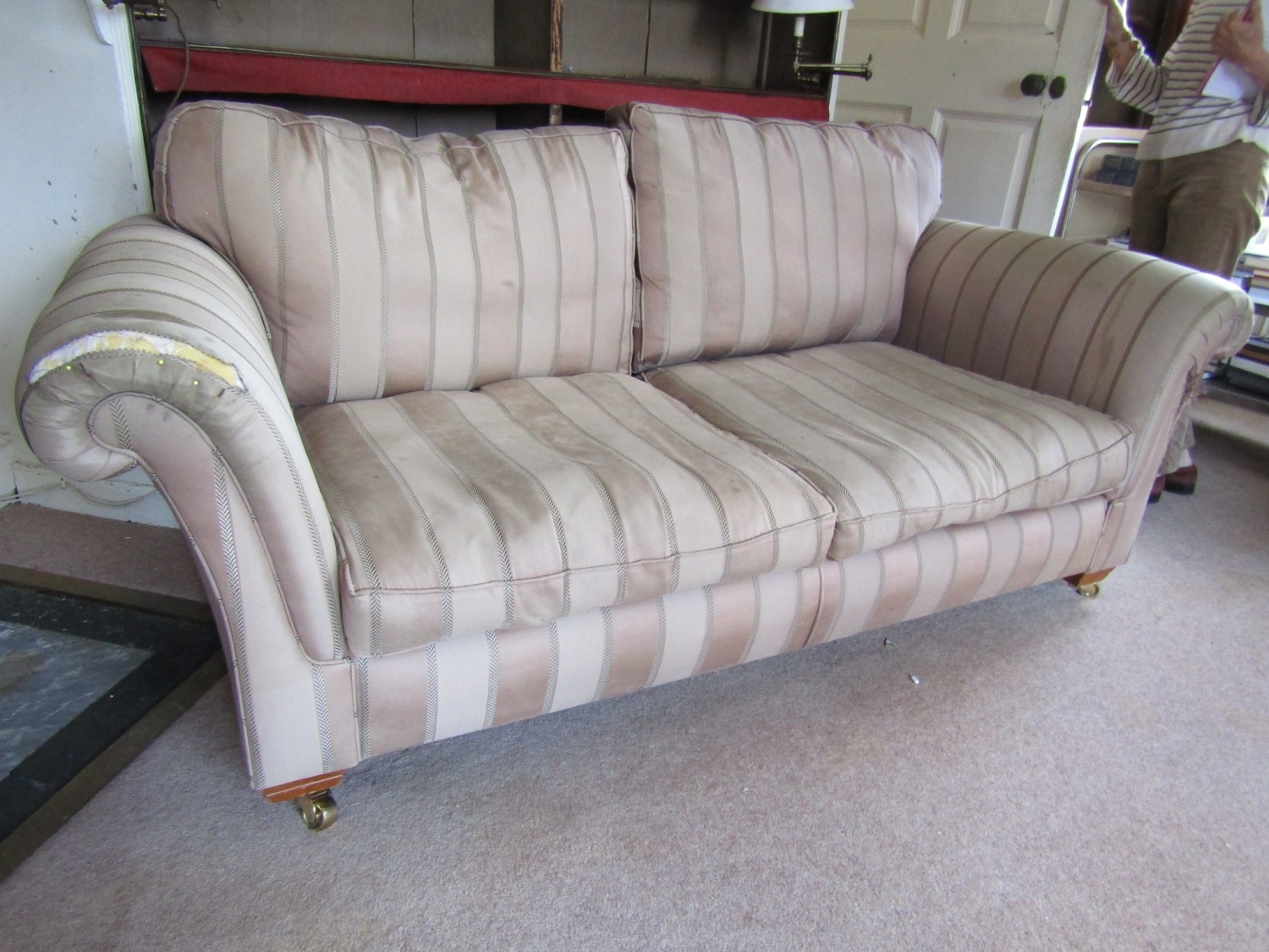Designer Two Seat Settee Scroll Arm Sides Above Brass Casters Approximately 6ft 6 Inches Wide