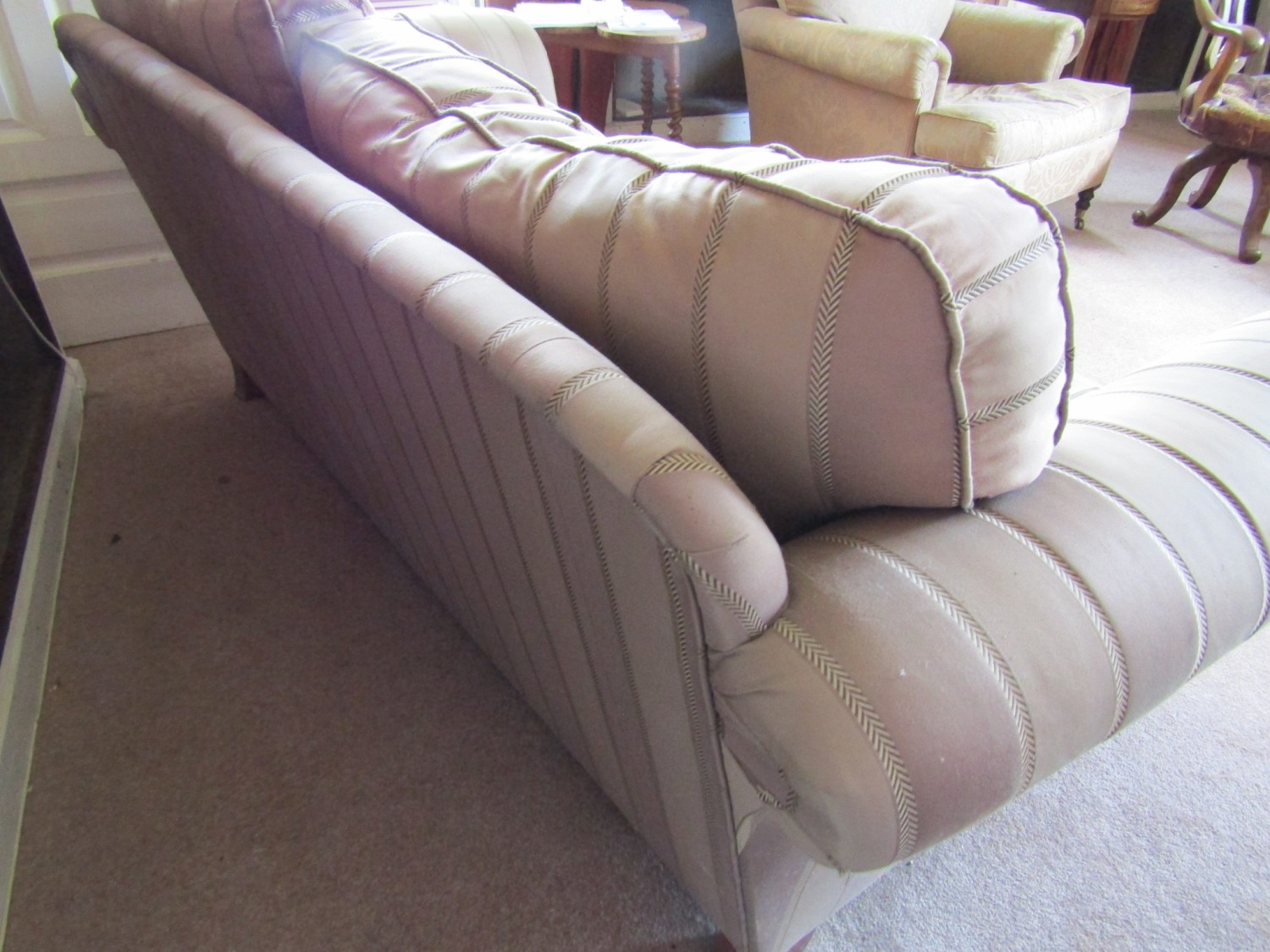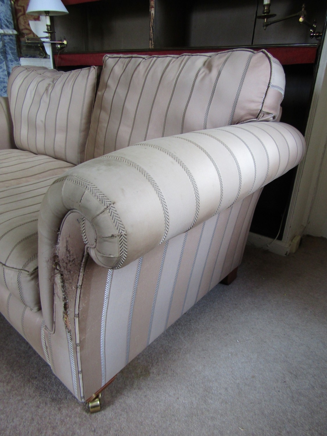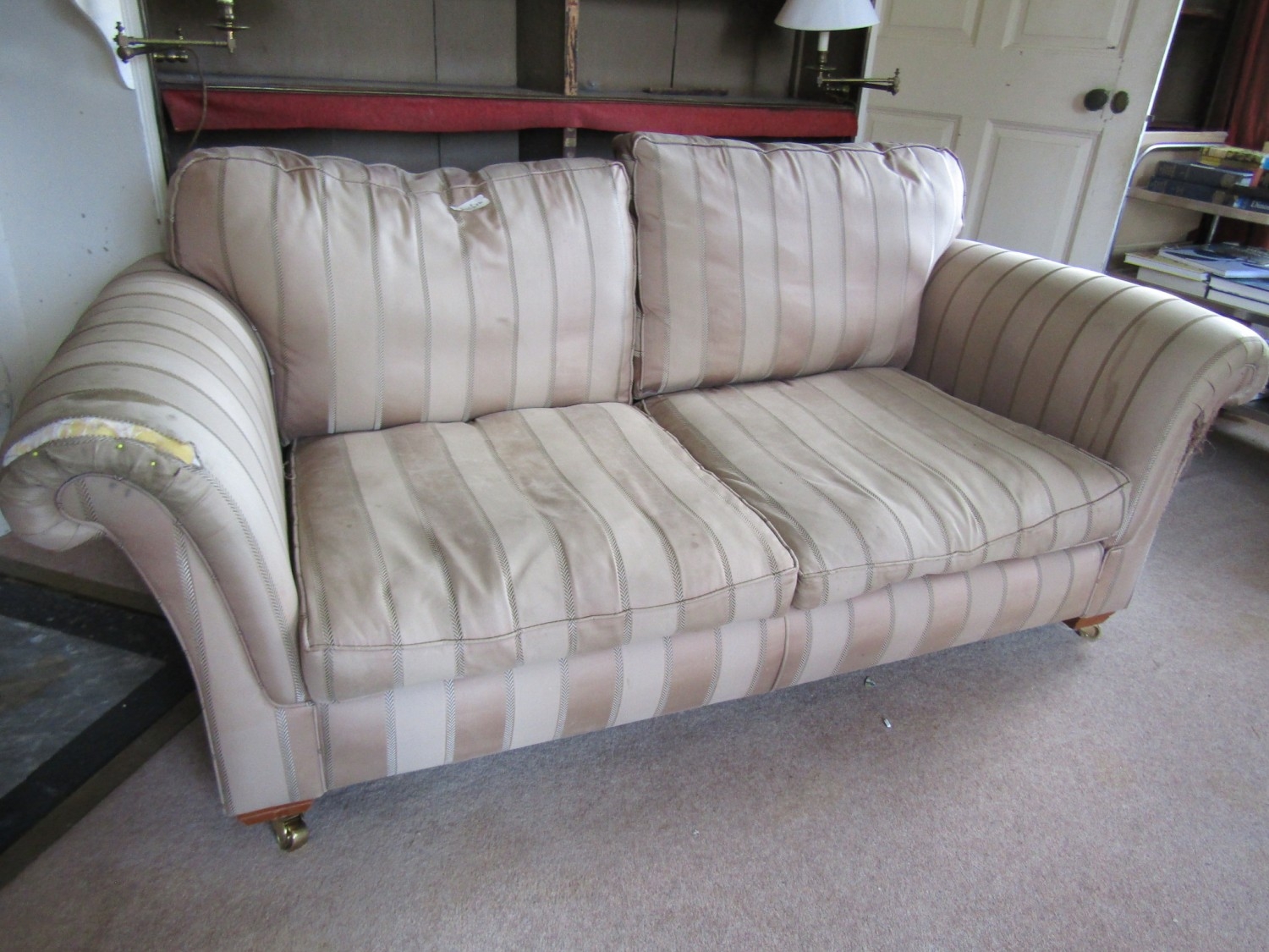 Designer Two Seat Settee Scroll Arm Sides Above Brass Casters Approximately 6ft 6 Inches Wide