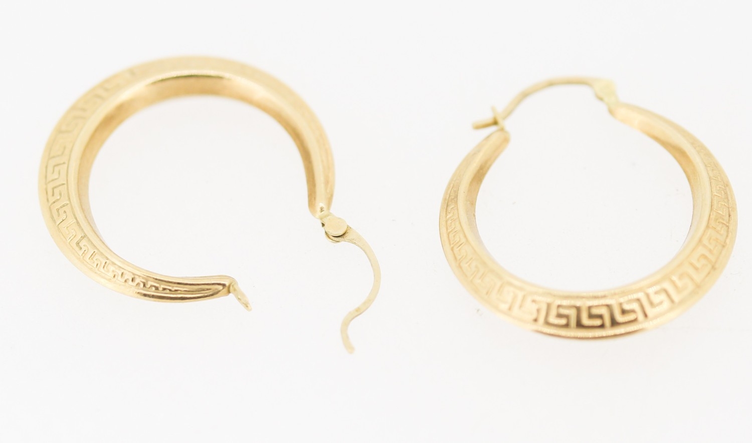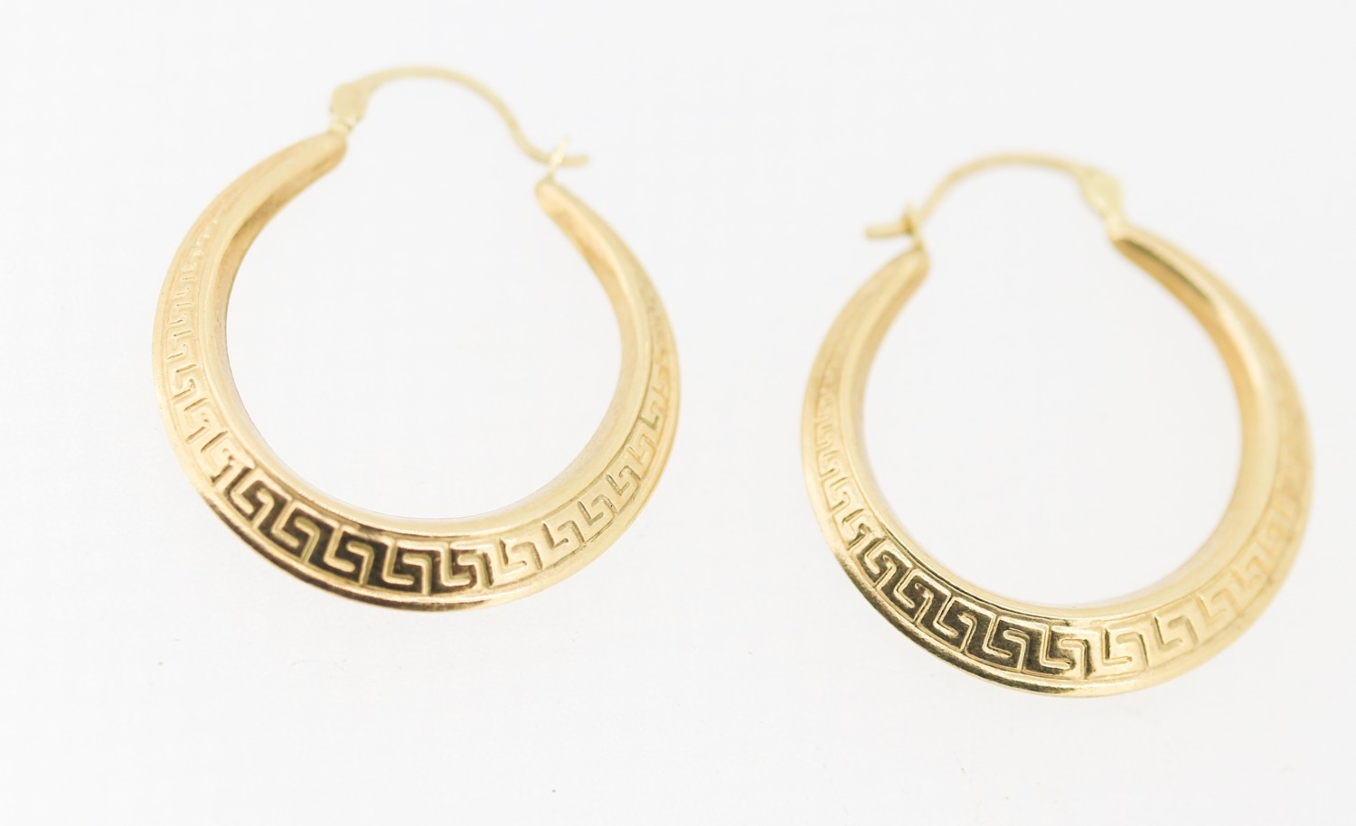 Pair of 9 Carat Yellow Gold Greek Key Motif Drop Hoop Earrings 3cm High