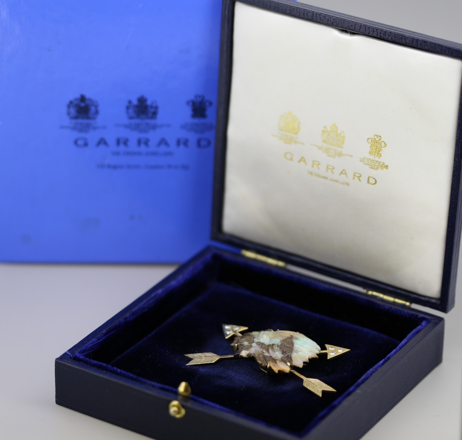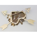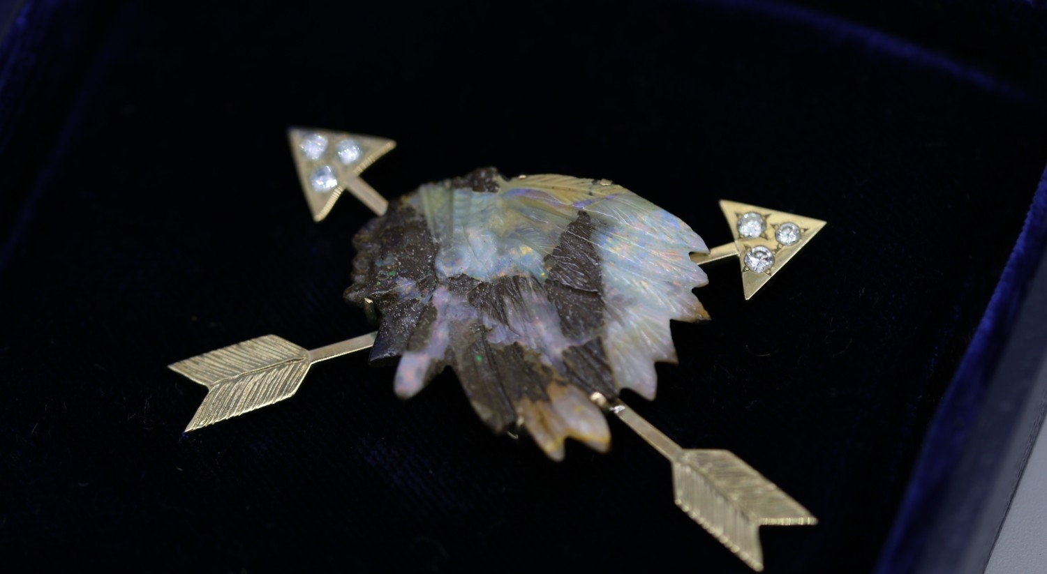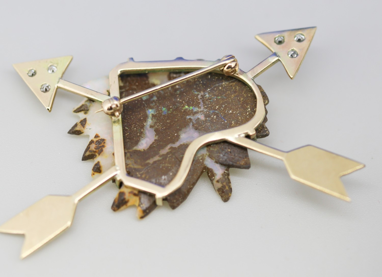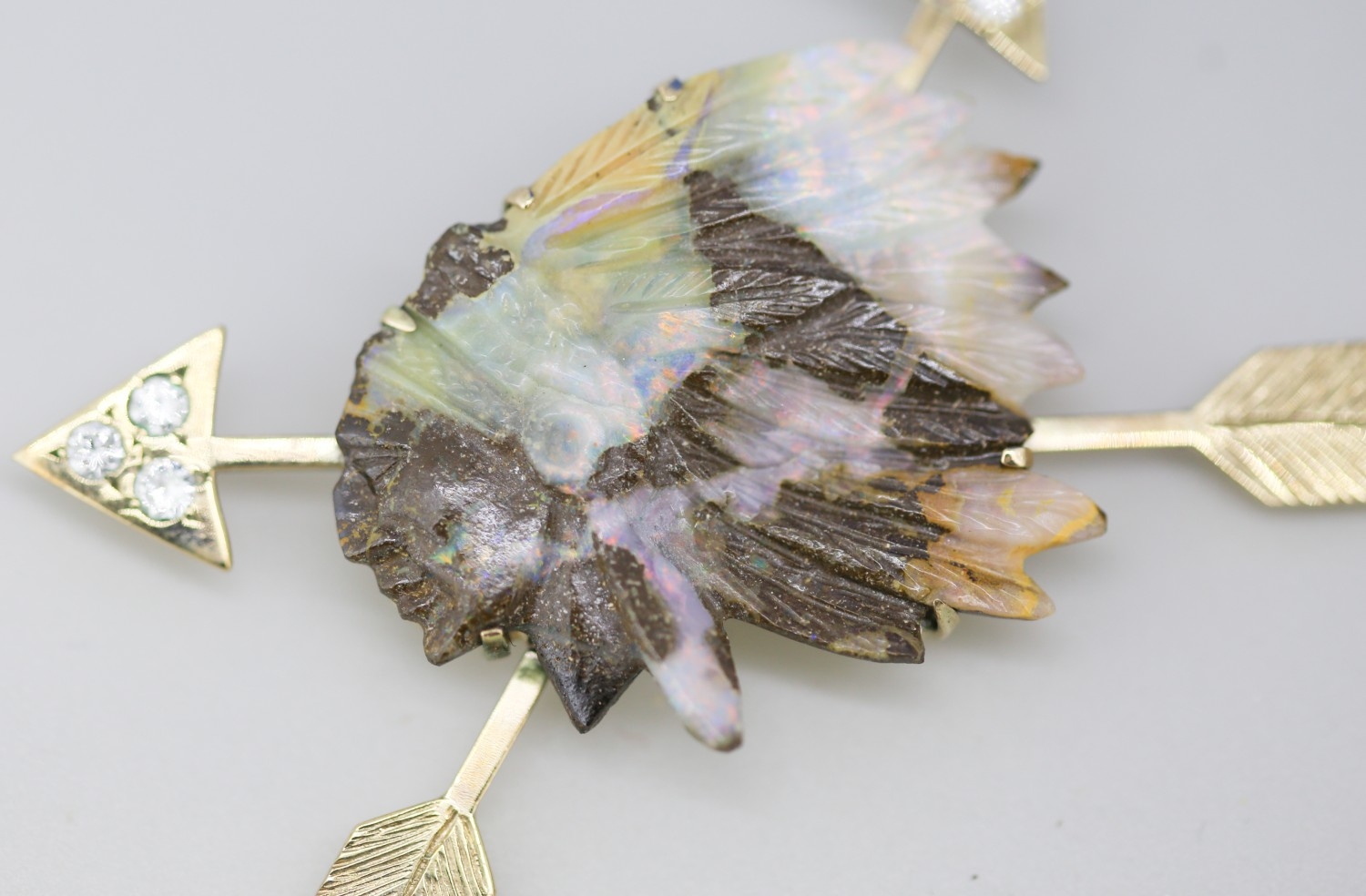 Finely Detailed Carved Boulder Opal Native American Chief Brooch with Diamond Six Stone Set Arrow Motifs Mounted in 9 Carat Yellow Gold 6cm wide 3.5cm High