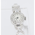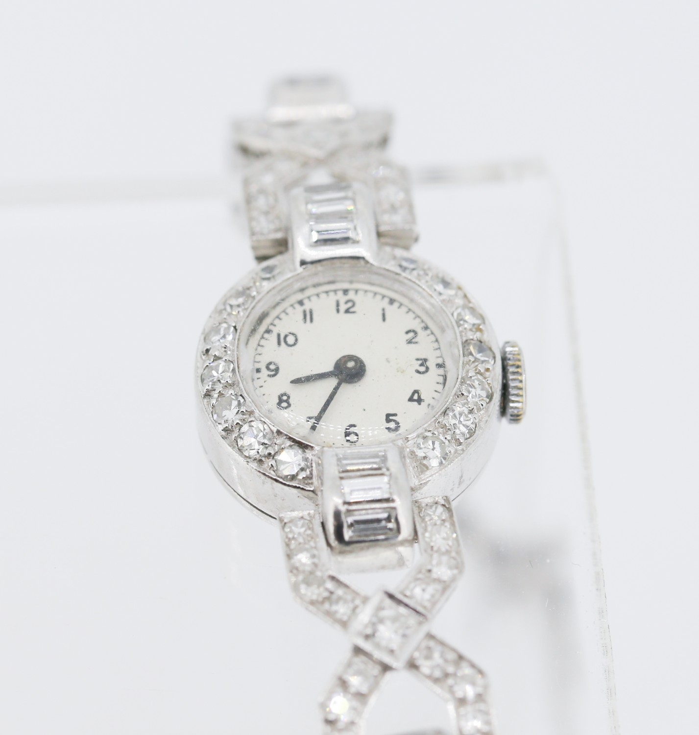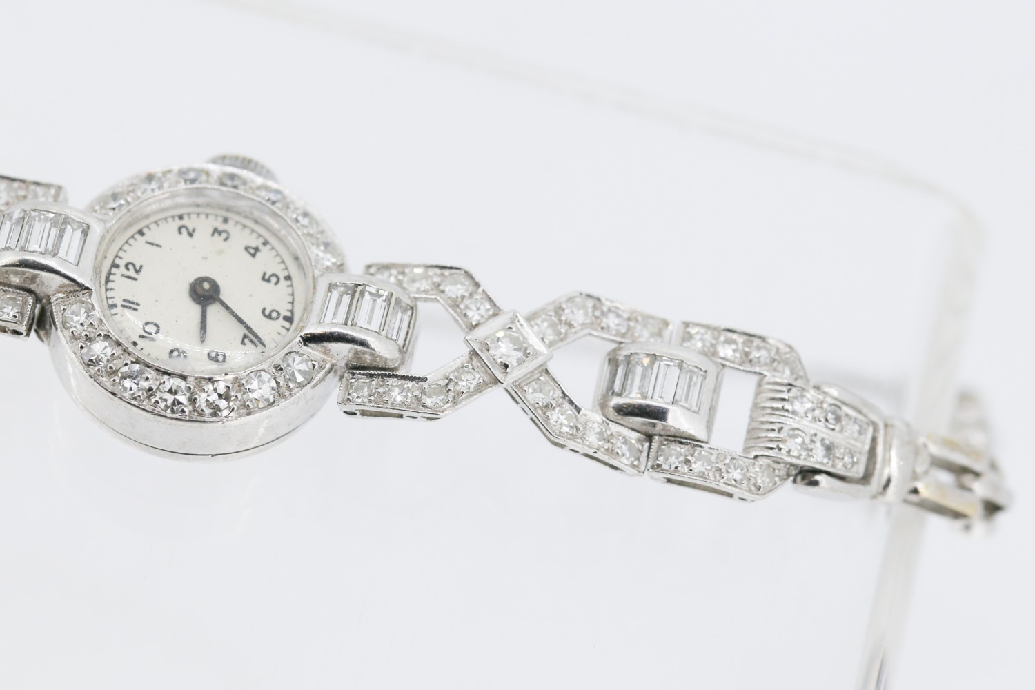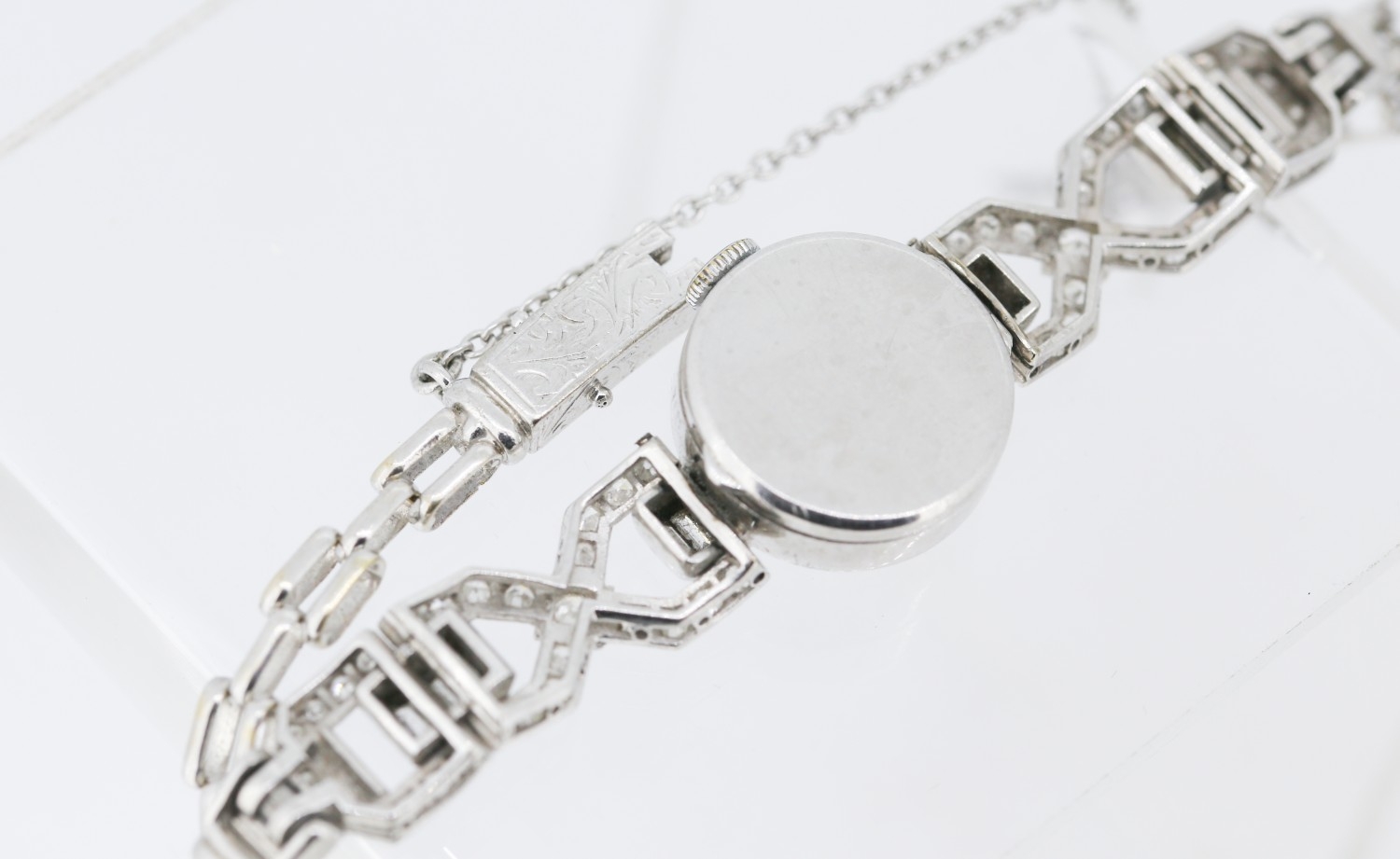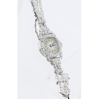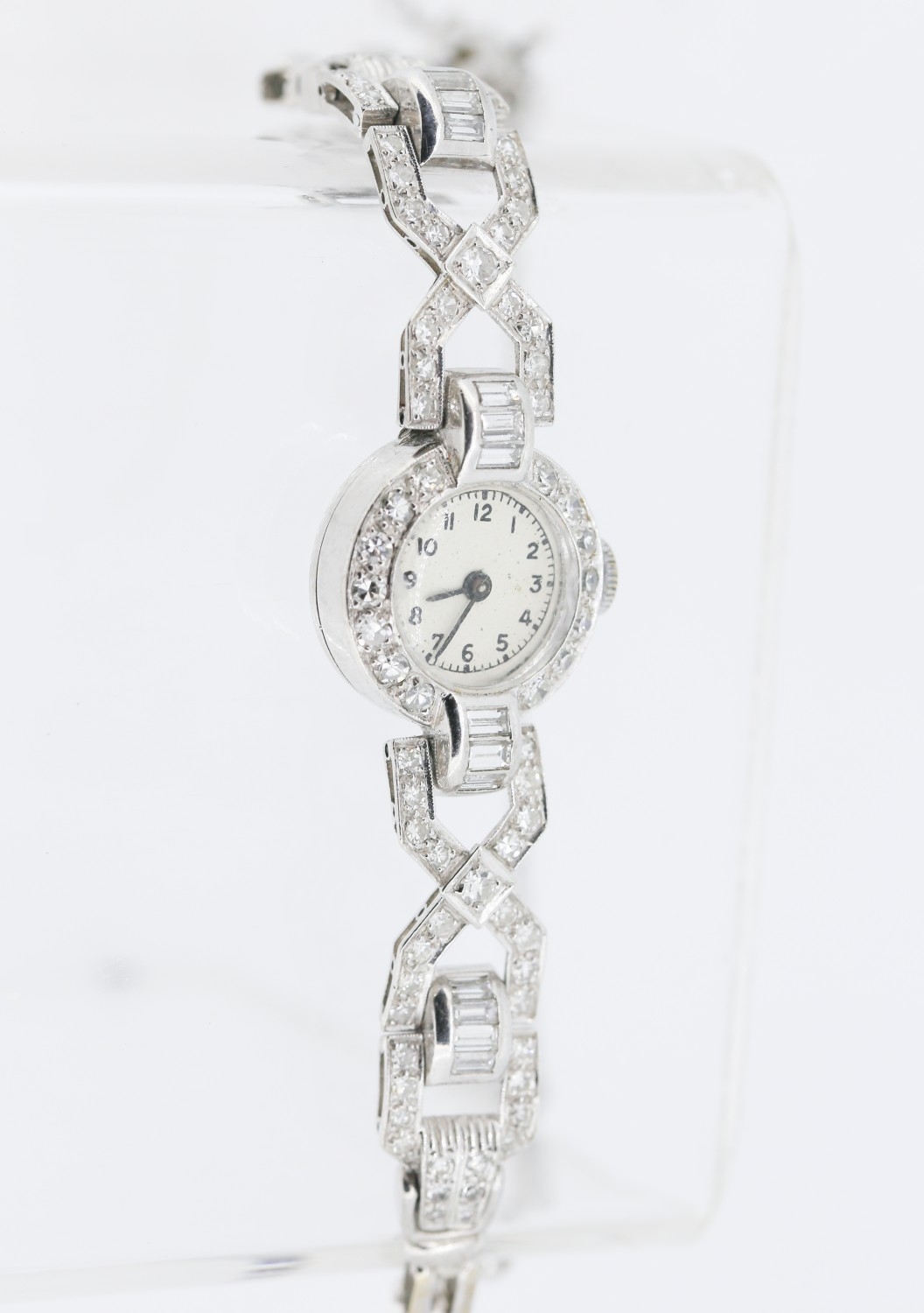Finely Detailed Round Cut and Baguette Cut Diamond Set Ladies Evening Watch Mounted in Platinum with Safety Chain Bracelet Length 18cm