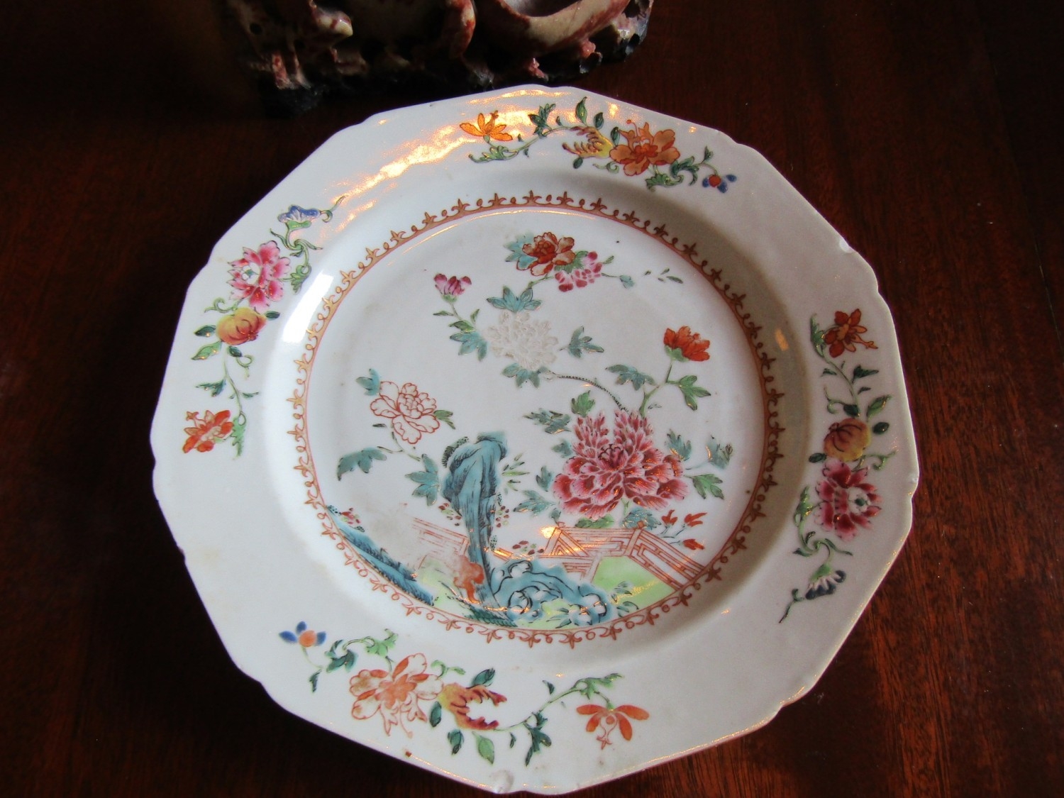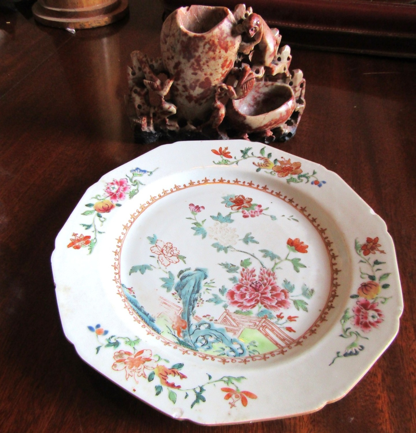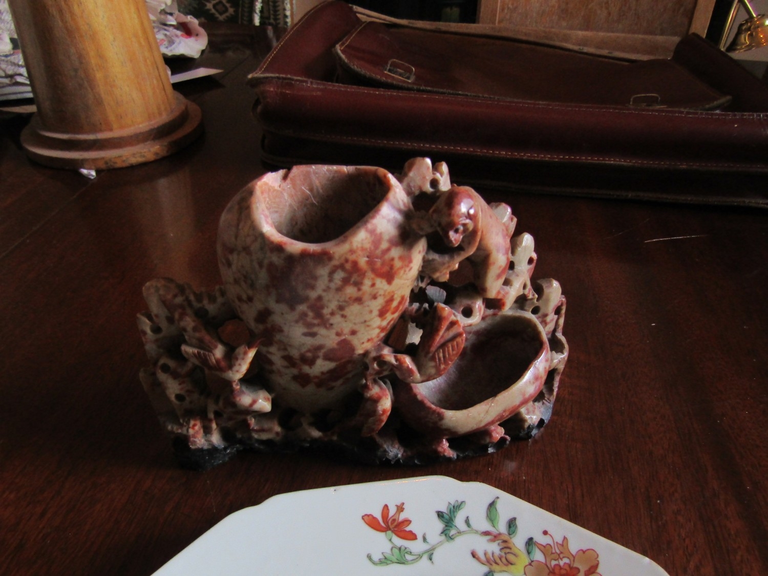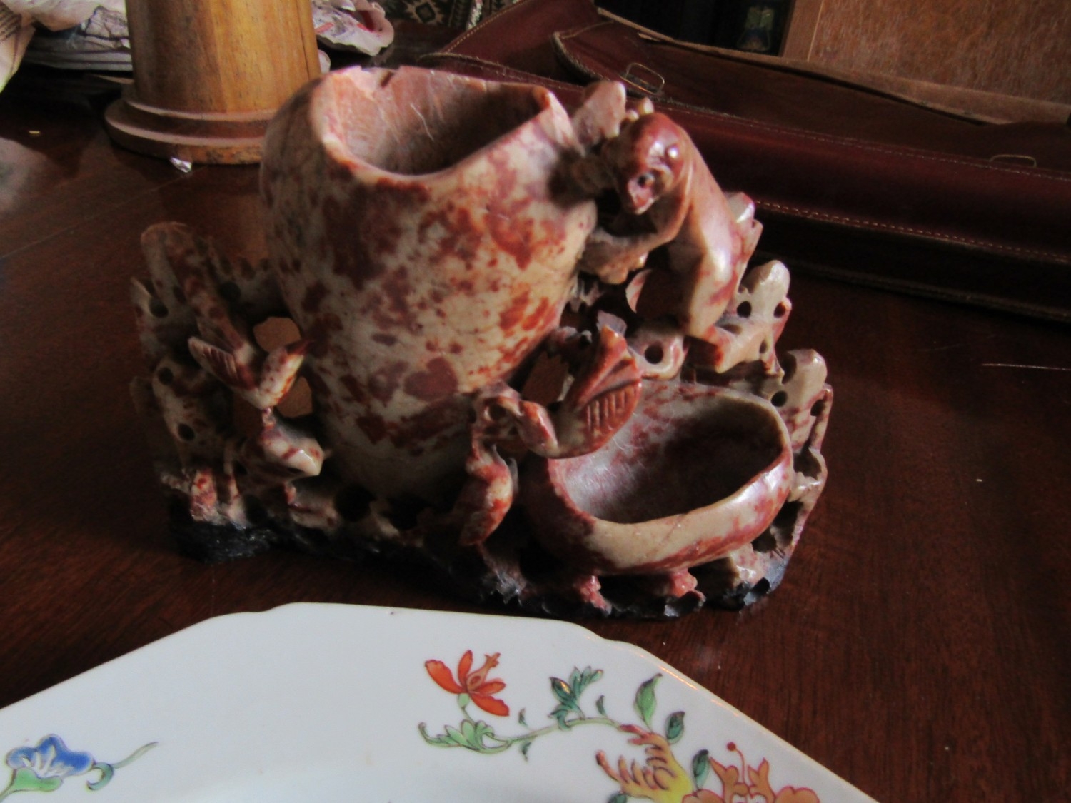Antique Carved Soapstone Ink Well Approximately Five Inches High and an Antique Chinese Export Dish Two in Lot